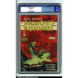 Famous Funnies #214 (Eastern Color, 1954). A very attractive, high-grade book, this is currently the nicest copy graded by CGC. The cover, one of the legendary Buck Rogers images by Frank Frazetta, is one of the more popular in the run. CGC VF/NM 9.0 Off-white pages. Overstreet 2001 NM 9.4 value = $975.  Important notice: We expect to be auctioning lots at the rate of 200-250 per hour. Sometimes eBay Premier live bid software cannot keep up with that pace, so we strongly recommend that you place a realistic proxy bid now as insurance to avoid disappointment. Also please note that all Heritage/CAA lots purchased through eBay Premier carry a 20% Buyer's Premium.