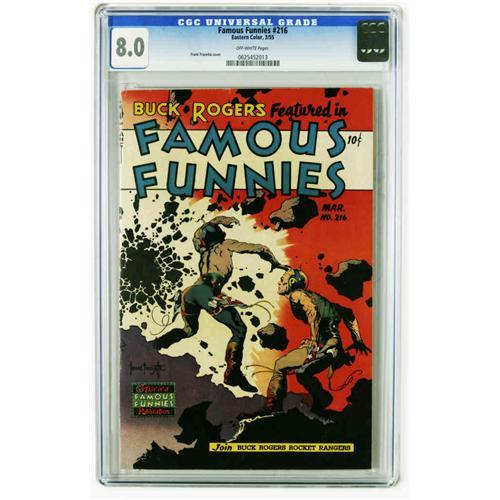 <B>Famous Funnies #216 (Eastern Color, 1955) CGC VF 8.0 Off-white pages.</B></I> Buck Rogers never looked more spectacular than on the great run of eight covers by Frank Frazetta. This issue had the last Frazetta cover in addition to being one of the final issues of the first monthly newsstand comic book series. Overstreet 2005 VF 8.0 value = $769. CGC census 12/05: 3 in 8.0, 4 higher.