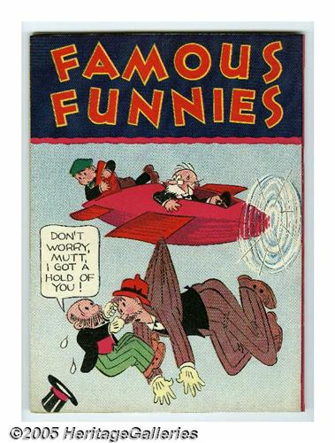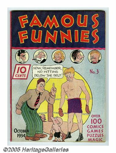 <B>Famous Funnies #3 (Eastern Color, 1934) Condition: Apparent FN/VF.</B></I> This is the first comic book appearance of Buck Rogers, and a rare Gerber "8" at that! <B>Famous Funnies</B></I> is one of the most historically significant comic series of all, in fact it's the first monthly newsstand comic title. In addition to Buck's first appearance, there's a plethora of other features, the best known being Joe Palooka by Ham Fisher and Mutt and Jeff by Bud Fisher. This copy can't be slabbed by CGC due to an overhang, so you can actually have a look inside this Platinum Age wonder. This copy has moderate professional restoration, and it's one of the best restoration jobs we've seen in a while. The page quality is quite nice, too -- the pages are cream with a wee bit of tanning at the edges. The restoration work is as follows: cover cleaned, staples supported, bindery chips filled, color touch along spine, and color touch along a subscription crease. Overstreet 2005 GD 2.0 value = $733; VG 4.0 value = $1,467; FN 6.0 value = $2,200; VF 8.0 value = $5,500.