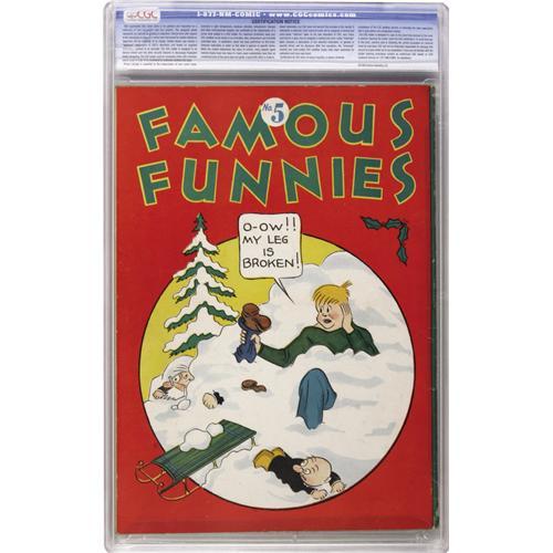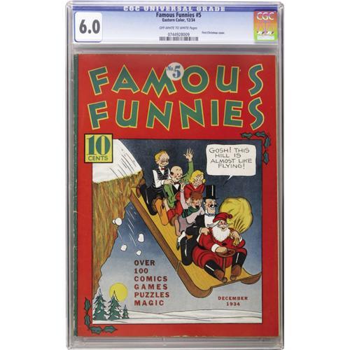 <B>Famous Funnies #5 (Eastern Color, 1934) CGC FN 6.0 Off-white to white pages.</B></I> We find the condition of this book truly amazing for a 1934 comic -- note the impossibly fresh colors! Yes, there's some spine stress, but this isn't some Silver Age comic we're talking about, it's one of the first handful of modern-format comics ever produced. The Christmas cover is the first ever for a newsstand comic. It's a Gerber "7," and this is the first copy we had ever seen. Overstreet 2006 FN 6.0 value = $699. CGC census 10/06: 1 in 6.0, 1 higher.<BR><BR><b>Shipping:</b> Slabbed Comic (<a target="_blank" href="http://www.heritageauctions.com/common/shipping.php">view shipping information</a>)