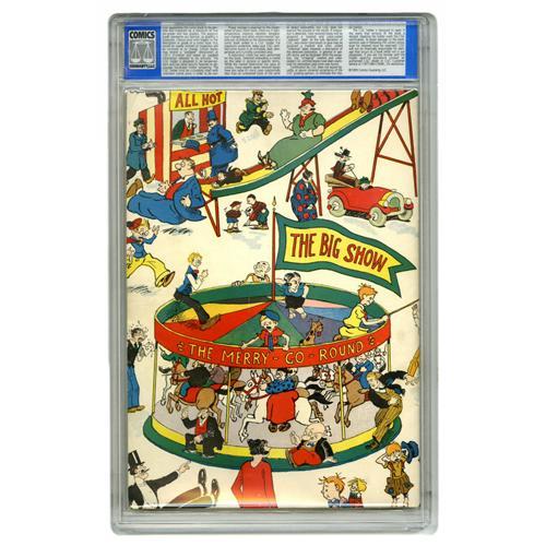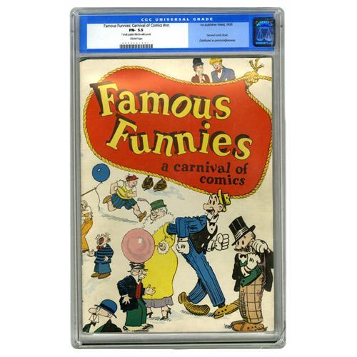 <B>Famous Funnies: A Carnival of Comics #nn (Eastern Color, 1933) CGC FN- 5.5 Cream pages.</B></I> Widely regarded as the second comic book ever published, <B>Famous Funnies: A Carnival of Comics</B></I> was the brainchild of M. C. Gaines, who sold it to a host of retailers including Kinney Shoe Stores, John Wanamaker, and Milk-O-Malt as a promotional giveaway. This "carnival" contains reprints of strips starring Joe Palooka, Mutt and Jeff, Reg'lar Fellers, and other favorites. In spite of the somewhat modest grade, this copy looks fantastic, with a clean white cover. CGC does note, "7 small puzzles filled in with pencil." At any rate, this is a truly historic item, one that doesn't show up often. A small crack in the CGC holder, visible in the lower right corner, does not affect the comic inside. Overstreet 2006 FN 6.0 value = $2,740. CGC census 4/06: 3 in 5.5, 10 higher.