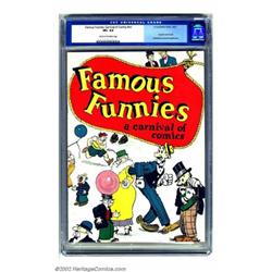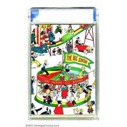 Famous Funnies: Carnival of Comics #1 (Eastern Color, 1933) CGC VF+ 8.5 Cream to off-white pages. It would be five years before the Golden Age of comics would even begin when, in 1933, this collection of newspaper reprints would be issued. Regarded as the second comic book, this promotional giveaway was M. C. Gaines' brainchild. Gerber's The Photo-Journal Guide to Comic Books lists this as "rare," with only 11 to 20 copies estimated to exist. This copy ranks second among those graded to date by CGC of this un-numbered artifact. From a historically significant perspective, this would appear to be an undervalued nugget. Overstreet 2002 VF 8.0 value = $5,480. Important notice: We expect to be auctioning lots at the rate of 200-250 per hour. Sometimes eBay Premier live bid software cannot keep up with that pace, so we strongly recommend that you place a realistic proxy bid now as insurance to avoid disappointment. Also please note that all Heritage/CAA lots purchased through eBay Premier carry a 20% Buyer's Premium. Please make sure you read the Terms and Conditions.
