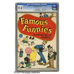 <B>Famous Funnies: Carnival of Comics #nn (Eastern Color, 1933) CGC VF/NM 9.0 Off-white pages.</B></I> Considered the second comic book ever, this Platinum Age oldster shows up more often than you might think, but not in this grade. Our offering is currently tied with one other copy atop CGC's census. A unique wraparound cover adds to the appeal of this historic book that Gerber's <B>Photo-Journal Guide to Comic Books</B></I> calls "rare". Overstreet 2004 VF/NM 9.0 value = $8,740; NM- 9.2 value = $12,000. CGC census 1/05: 2 in 9.0; none higher. <I>From the Northern Lights Collection</B></I>.