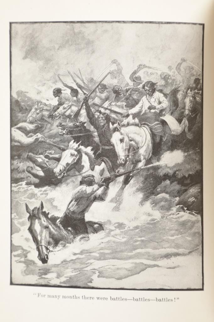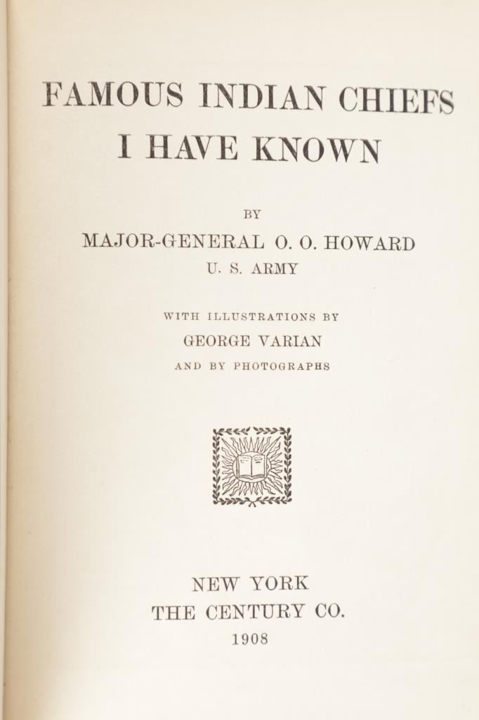 Included in this lot is "Famous Indian Chiefs I Have Known" by O.O. Howard, 1908, The Century Co., New York, publisher, with illustrations by George Varian and by photographs. A collection of short biographies of famous Native Americans. In 1872, President Ulysses S. Grant sent O.O. Howard (1830-1909), widely known as the "Christian general", as an ambassador of peace to the western Indian tribes. This is Howard's account of his journey. He tells of his peace agreement with the great Apache chief Cochise; describes his pursuit and surrender of the Nez Perce chief Joseph, who became his friend; and provides a poignant glimpse of the defeated Apache war leader Geronimo selling canes and autographs. Equally impressive are his portraits of Winnemucca of the Paiutes, the Sioux chiefs Red Cloud and Sitting Bull, and his descriptions of meetings with Washakie of the Shoshones, Pasqual of the Yumas, Antonio of the Pimas, Santos and Pedros of the Apaches, Manuelito of the Navajos, three Indian women, Sarah Winnemucca, granddaughter of the Paiute chief, and Mattie, her sister-in-law, both of them powerful peacemakers in their own right. Included are chapters on the Seminole chief Osceola and the Modoc chief Captain Jack, famed for their resistance to white domination. Howard was the founder of Howard University in Washington D.C., and served as its president 1867-73. This reddish brown stamped illustrated hardcover is in very nice condition, scuffing noted on edges. Intact pages exhibit age tanning. Measures 5.25"W x 7.75" x 1.25"D.