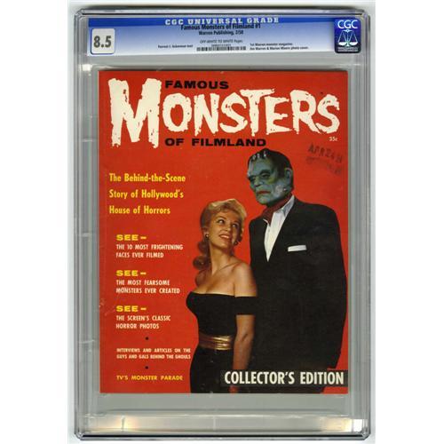 <B>Famous Monsters of Filmland #1 (Warren, 1958) CGC VF+ 8.5 Off-white to white pages.</B></I> When this first Warren monster magazine hit newsstands, it not only started the monster-mag genre, it was the first taste of success for Warren (their only previous publication had been a short-lived <B>Playboy</B></I> knockoff called <B>After Hours</B></I>). The combination of monster-flick photos and Forrest Ackerman's text found favor with fans, and the series was off to a run that lasted 35 years. Also of note is a two-page Frankenstein parody by Bill Elder and Harvey Kurtzman. By the way, the masked fellow on the cover is publisher Jim Warren! Jerry Weist notes in his <B>Comic Art Price Guide</B></I> that #1 "is extremely scarce in conditions above a strict very fine." As the highest grade CGC has assigned for this issue to date is 9.0, we believe our offering to be one of the best copies available. Jerry Weist's Comic Art Price Guide VF 8.0 value = $550; NM 9.4 value = $1,500. CGC census 2/07: 3 in 8.5, 6 higher.<BR><BR><b>Shipping:</b> Comics - Slabbed (certified) (<a target="_blank" href="http://www.heritageauctions.com/common/shipping.php">view shipping information</a>)