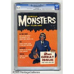 <B>Famous Monsters of Filmland #2 (Warren, 1958) CGC FN- 5.5 Off-white pages.</B></I> "Dear Monsters" letter page begins. First appearance of Monster Mail-Order section. Photo cover. Forrest J. Ackerman text. Jerry Weist's <B>Comic Art Price Guide</B></I> lists values of $100 in Good and $200 in Fine condition. CGC census 1/05: 1 in 5.5, 3 higher.