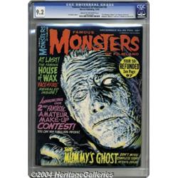 <B>Famous Monsters of Filmland #36 (Warren, 1965) CGC NM- 9.2 Cream to off-white pages.</B></I> If Vic Prezio's "The Mummy's Ghost" cover isn't enough to grab you, the back cover ad of Hollywood horror star masks -- from Frankenstein to "The Mole People" -- will certainly entice you to bid. Jerry Weist's <B>Comic Art Price Guide</B></I> lists a NM value of $45. <BR><BR><B>Important notice:</B> Heritage usually auctions material at the rate of 200-250 lots per hour. On some occasions eBay Live bid software or the Internet may not be able to keep up with the pace of the auction. We recommend placing a realistic absentee bid now as insurance to avoid disappointment. Occasionally the auctioneer may eliminate or reject an eBay Live bid, and the auctioneer may also reopen a lot after the close of the eBay live bidding (usually because we missed an audience bid), and may reject your bid even if it shows you as the winning bidder. By bidding via eBay Live, you agree that Heritage may award the lot to another bidder at its sole discretion under the circumstances described above or any other reasonable circumstances. Since eBay bids are not shown to us until we open the lot on the floor, we treat those bids just like floor bids. In most cases the floor responds before the eBay bid is presented to us, due to Internet lag time, so for consistency we have made it a policy that floor bids are always considered first over tie eBay live bids. Also please note that all Heritage lots purchased through eBay Live carry a 20% Buyer's Premium. Please make sure you read the Terms and Conditions before you bid. </span></font></tr></table></td></tr></table>