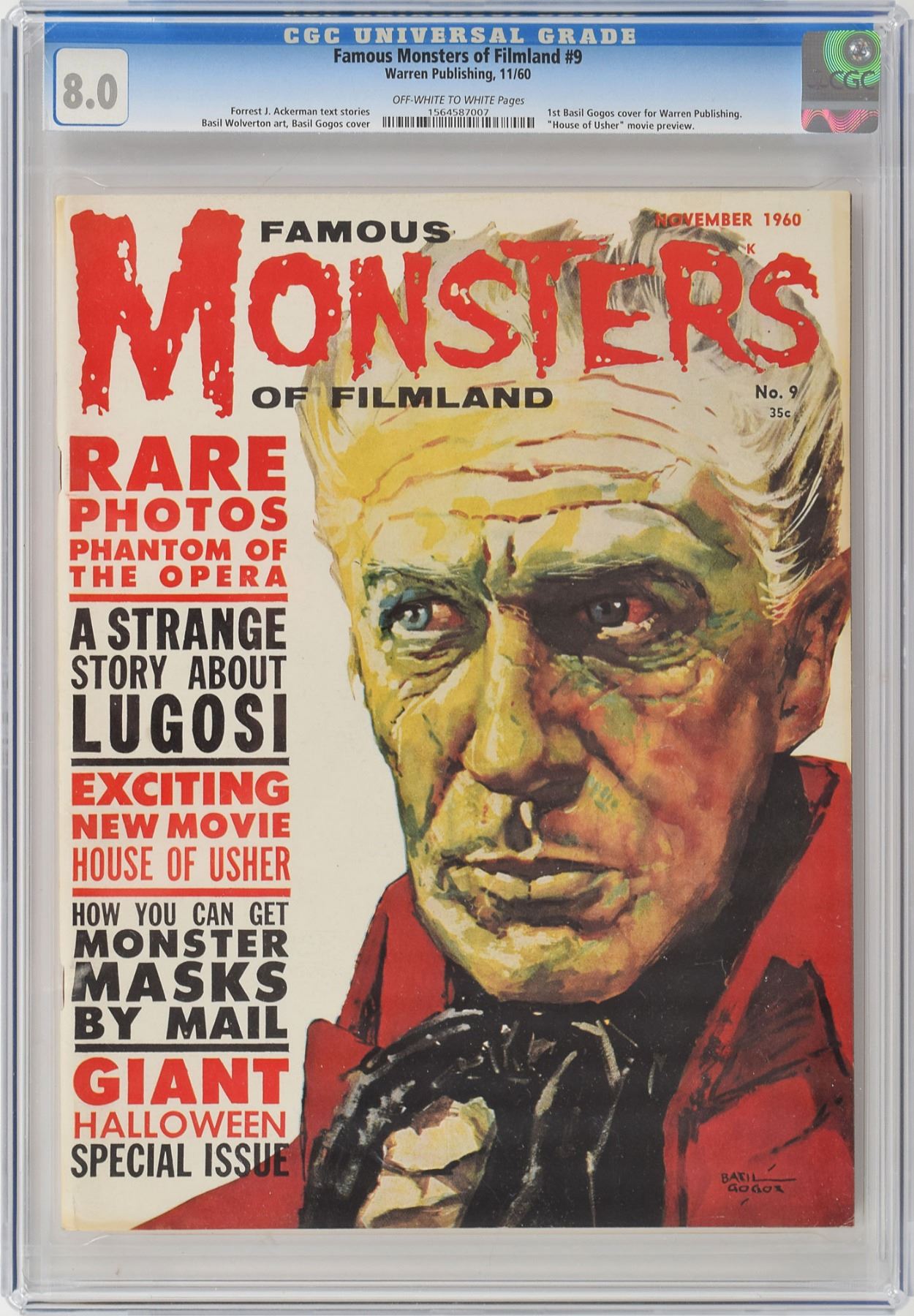 Group of eleven issues of Famous Monsters of Filmland magazine, dating from February 1960 to July 1962, including seven graded by CGC. The highlights of the group are Famous Monsters of Filmland #6, February 1960, featuring King Kong (CGC 7) and Famous Monsters of Filmland #9, featuring Vincent Price (CGC 8). Overall grades range from 6 to 8. It is rare to have ten consecutive early issues of this classic magazine offered in a single lot—an extremely desirable instant collection.