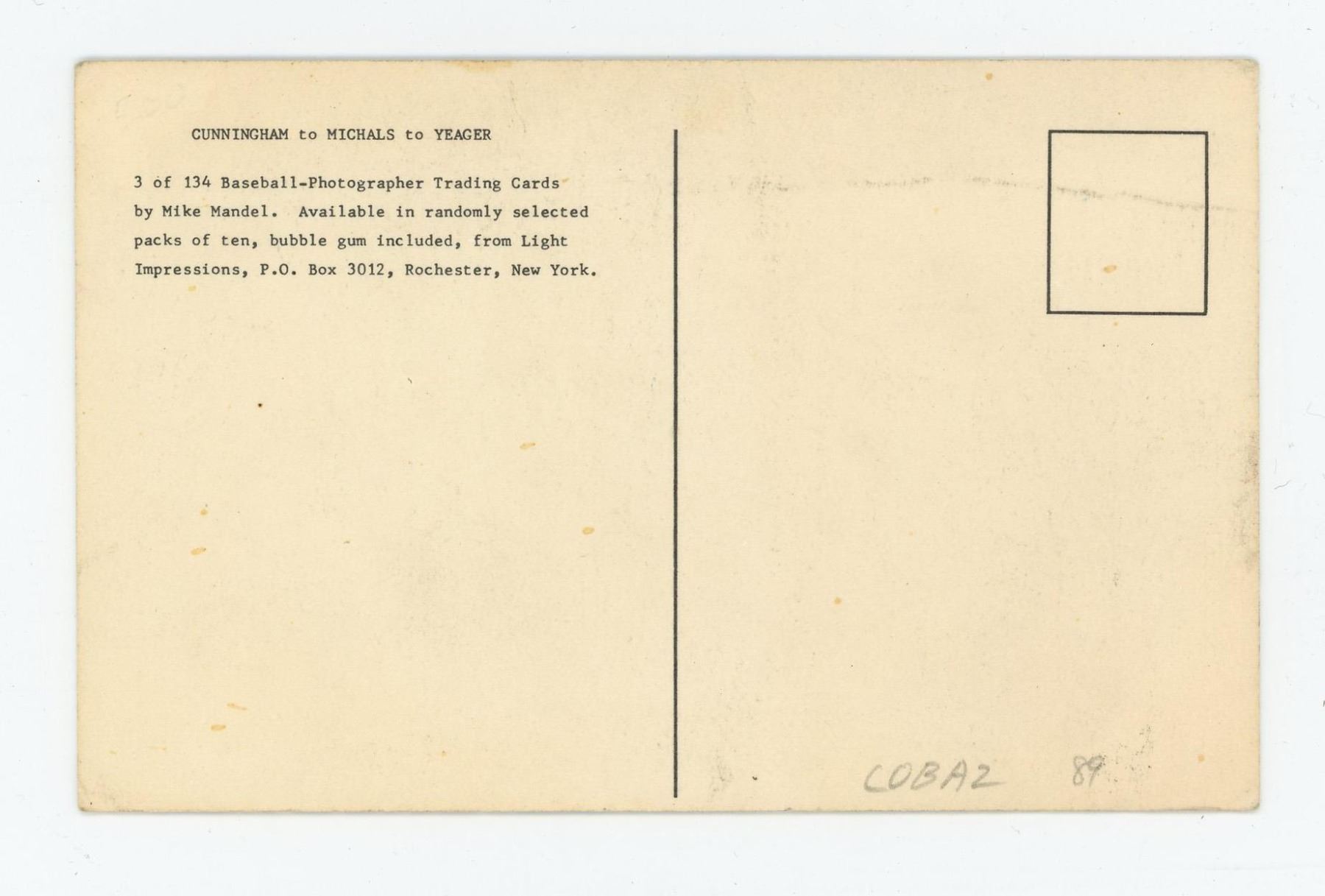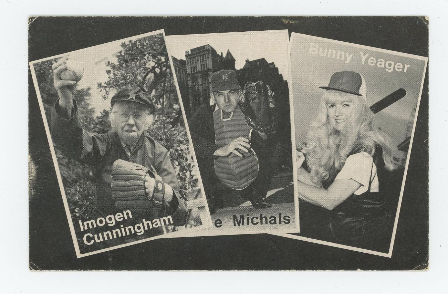 Image shows 3 famous photographers posed as baseball players from a 1975 playing card set created by Mike Mandel. The three photographers pictured are Imogen Cunningham, Duane Michals and Bunny Yeager.
