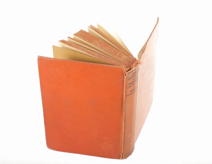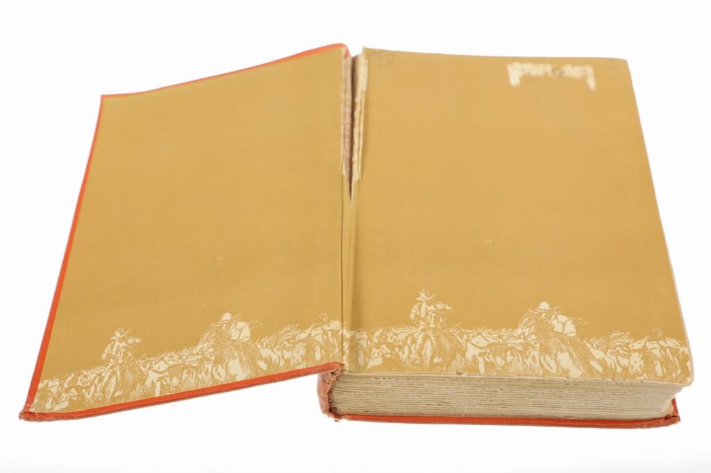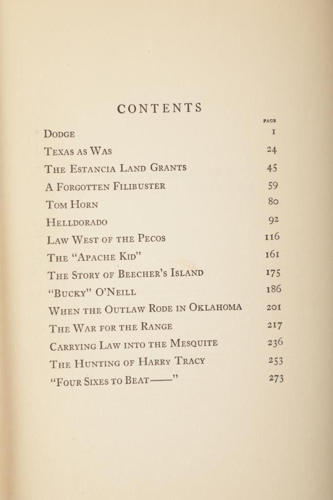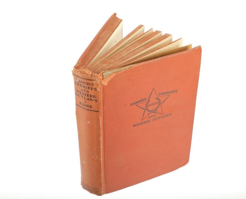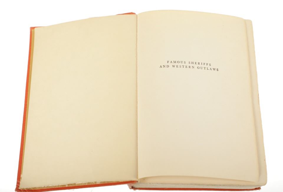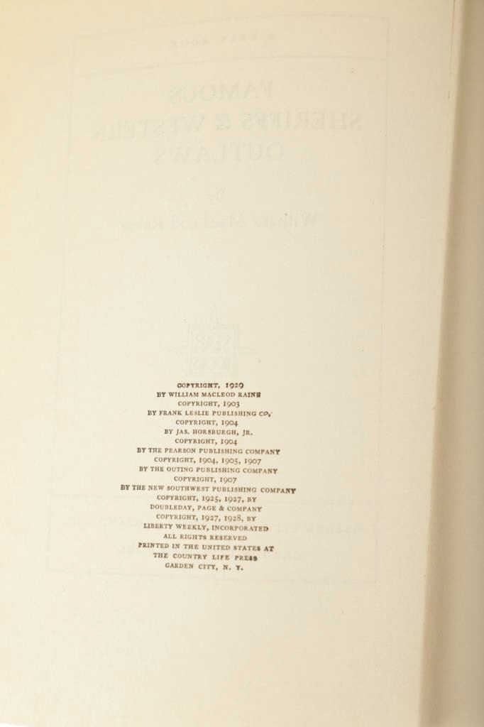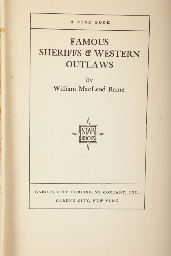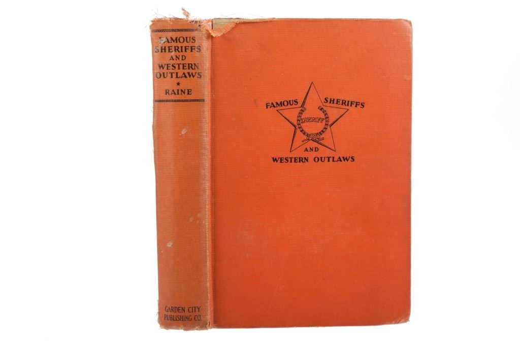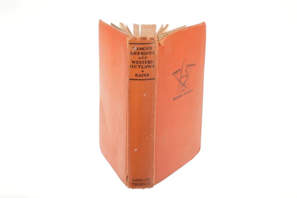 Featured in this lot is this 1929 edition of Famous Sheriffs & Western Outlaws by William MacLeod Raine, Garden City Publishing Company, Inc., Garden City, New York, copyright William MacLeod Raine 1929. Gunfights, Feuds, Range Wars, Tough Killers & Daring Sheriffs, this is a biography of legendary heroes and villains, sheriffs and western outlaws of America's Old West. The Old West has spawned its share of tall tales and legends, and here William MacLeod Raine brings a flair for storytelling to his accounts of gun fights and showdowns in Dodge, as well as Wild West Texas, Colorado, and Oklahoma. First published when there were still people alive who recalled these gunslingers, this anecdotal history recounts the exploits of rogues and lawmen like John Wesley Hardin, Doc Holliday, Tom Horn, the "Apache Kid," Bucky O'Neill, Tom Nickson, Pat Garrett, and Harry Tracy. Novelist William MacLeod Raine recalls standoffs, shootouts, rowdy saloons, brave men who protected innocent townspeople, and villains who put the “wild” in Wild West. Raine published these essays over a 26 year period (1903-1929) in which he tried to chronicle the history of the American west and its heroes and badmen. In some cases he claims to have actually sat down with the individual to hear his story first hand. He wrote whole chapters on Tom Horn, John Wesley Hardin and the Apache Kid. Other famous individuals covered in chapters organized by theme included Bill Hickok, Wyatt Earp, John Slaughter, Doc Holliday, Bat Masterson and Biily Bonney. One chapter explains the history of Spanish Land Grants that have been the basis for many western movie and novel. William MacLeod Raine (1871-1959), was a British-born American novelist who wrote fictional adventure stories about the American Old West. In 1959, he was inducted into the Hall of Great Westerners of the National Cowboy & Western Heritage Museum. This orange clothbound stamped illustrated hardcover is iin good overall condition Scuffing and slight tears to cover edges noted. Intact deckled pages exhibit age tanning, no other obvious marring noted. Measures  5.75"W x 8.5"L x 1.25"D