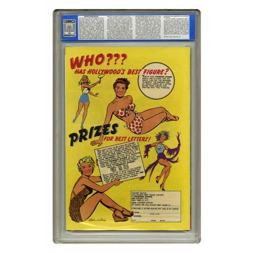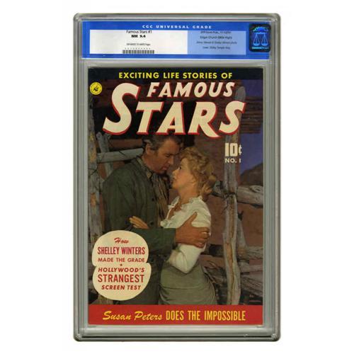 <B>Famous Stars #1 Mile High pedigree (Ziff-Davis, 1950) CGC NM 9.4 Off-white to white pages.</B></I> We were almost tempted to place this item in one of our Hollywood Memorabilia sales -- it's an unusual hybrid of Movie Magazine and Comic Book! Gracing the cover of this first issue is James Stewart and Shelly Winters, in a scene from the film "Winchester 73," and on the back cover are a few lovely starlets as illustrated by Ogden Whitney, including Marilyn Monroe. Inside, a Shirley Temple story is featured. This Edgar Church Mile High pedigreed copy is currently the only copy certified by CGC. Overstreet 2005 NM- 9.2 value = $400. CGC census 12/05: 1 in 9.4, none higher.