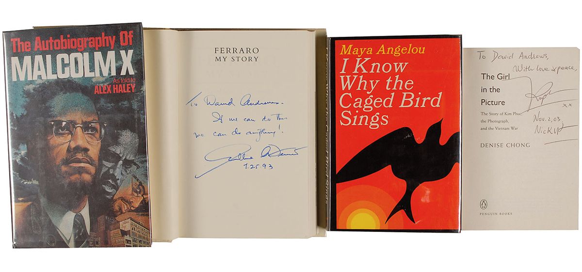 Four books, three hardcover and one softcover: The Autobiography of Malcolm X, signed and inscribed by Betty Shabazz; I Know Why the Caged Bird Sings, signed and inscribed by Maya Angelou; Ferraro: My Story, signed and inscribed by Geraldine Ferraro; and The Girl in the Picture, signed and inscribed by Kim Phuc. In fine overall condition.