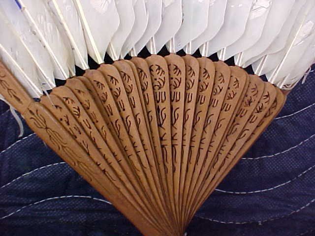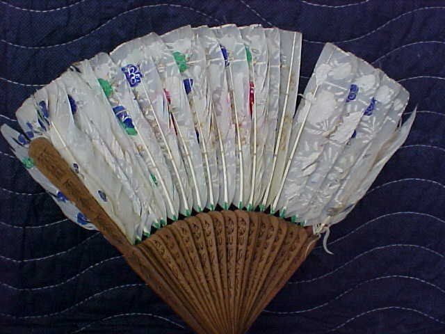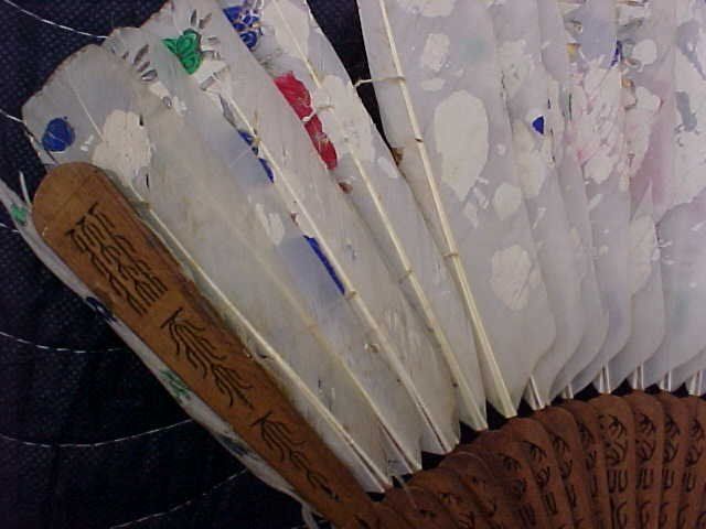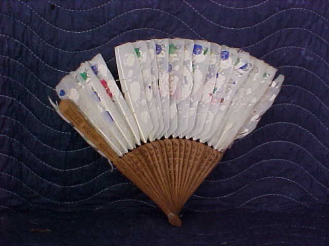Fan #14. 1870-1890 small (9" x 14") hand painted Oriental folding feather fan painted on both sides. feathers have some issues and the paintings have rubbed off. in good condition for its advanced age. Wooden carved sticks in very good condition. one has small piece missing but very hard to see. check out pictures.