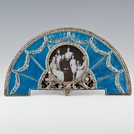 Fan Style Lacquer Faberge Frame, The picture frame is in two colors enamel surrounded by a crystal set ribbon tie suspended by a laurel garland. The frames edges are covered with laurel border. Dimensions: 6.5in (D), Photo Opening Dimensions: 1.75in (D), Material: Pewter, Enamel, Crystals