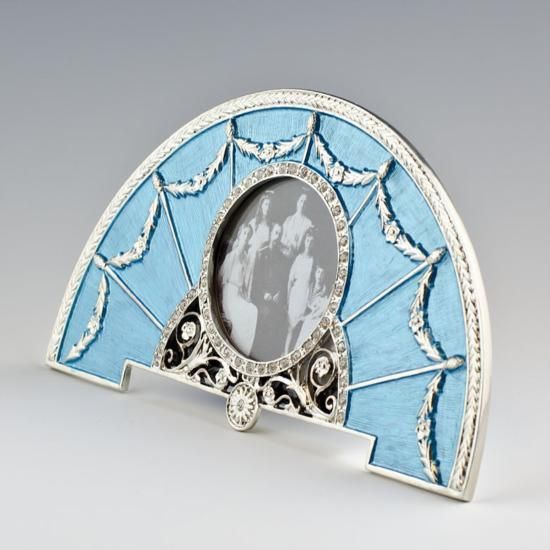 Fan Style Lacquer Faberge Frame, The picture frame is in two colors enamel surrounded by a crystal set ribbon tie suspended by a laurel garland. The frames edges are covered with laurel border. Dimensions: 6.5in (D), Photo Opening Dimensions: 1.75in (D), Material: Pewter, Enamel, Crystals