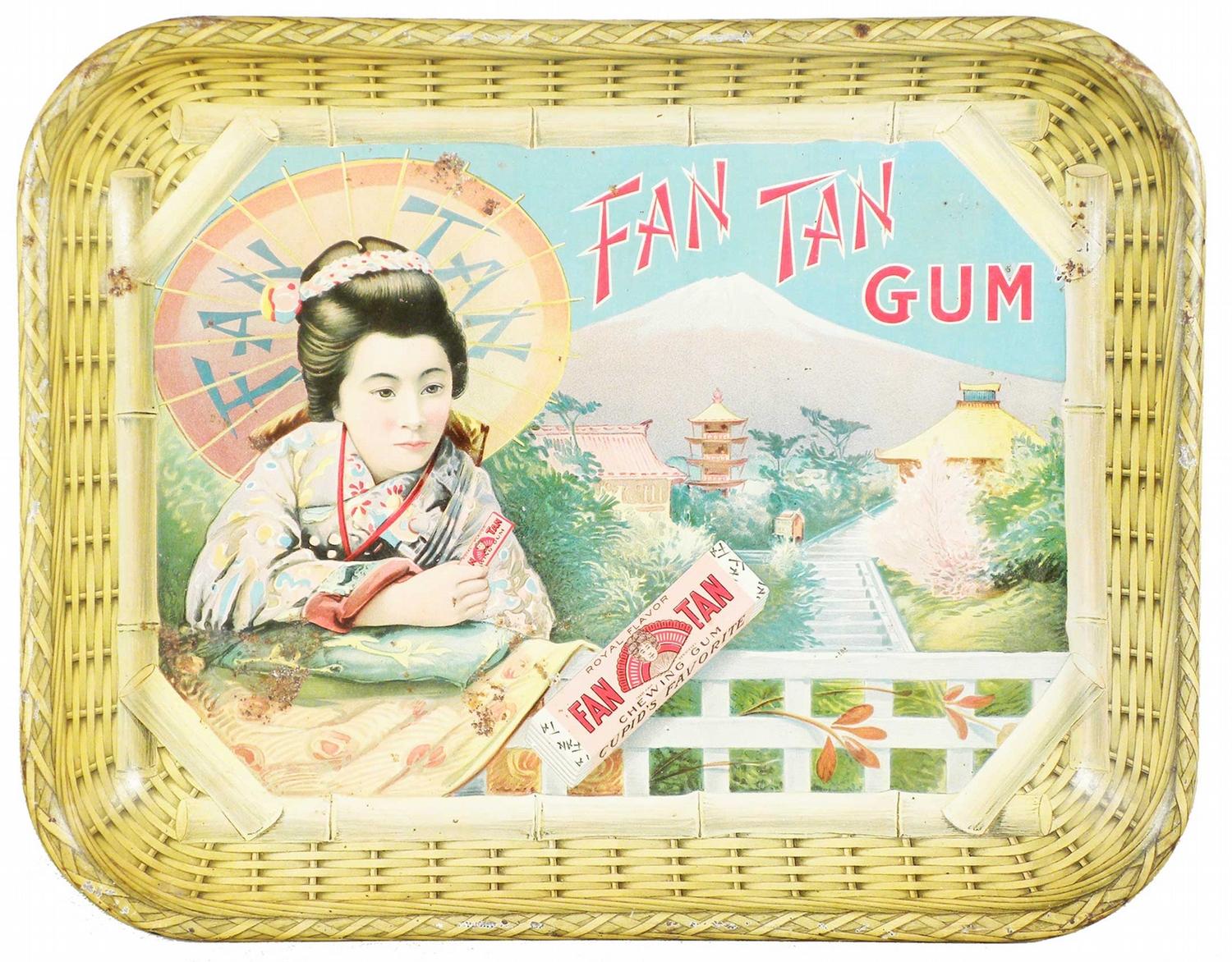 Fan Tan Chewing Gum Tin Serving Tray. "Cupids Favorite". Some minor rust spots otherwise good condition. 13 1/4 X 10 1/2 inches.