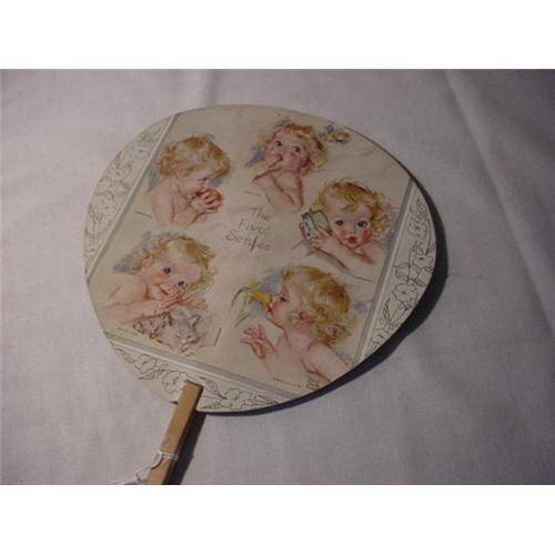 The Five Senses fan is picture of darling little baby girls feeling, tasting, seeing, hearing, and smelling.  This fan is very old.  The printing on the back reads:  Louis Stein, Inc. Funderal Home, 117 Frederick Street, Cumberland, Md., Ambulance Service, Phone 27.  How about that phone number?  There is a crease lower right by the handle which also is noticeable from the front lower left, of which there is a closeup picture.  The artist's name appears lower right.