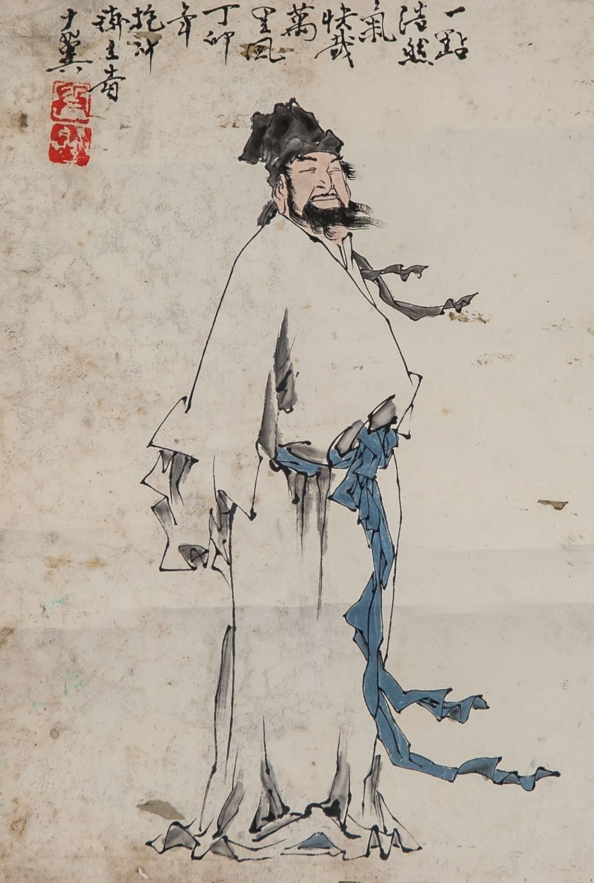 Watercolor and ink on paper roll, featuring poet Su Shi, signed Fan Zeng (1938- , Chinese), inscribed with 2 artist seals, 32 x 22.5 cm. Fan Zeng is contemporary Chinese artist known for his mastery of traditional Chinese painting techniques. His works fuse elements of landscape, flower-and-bird, and figure painting, as well as forms of poetry and calligraphy. He held solo exhibitions in Japan throughout the 1980s, and participated in various exhibitions in Asia. In addition, he has received numerous awards in design and painting. He became a professor of Eastern Art at Nankai University, and was made department head in 1993. The artist currently lives and works in Beijing, China.