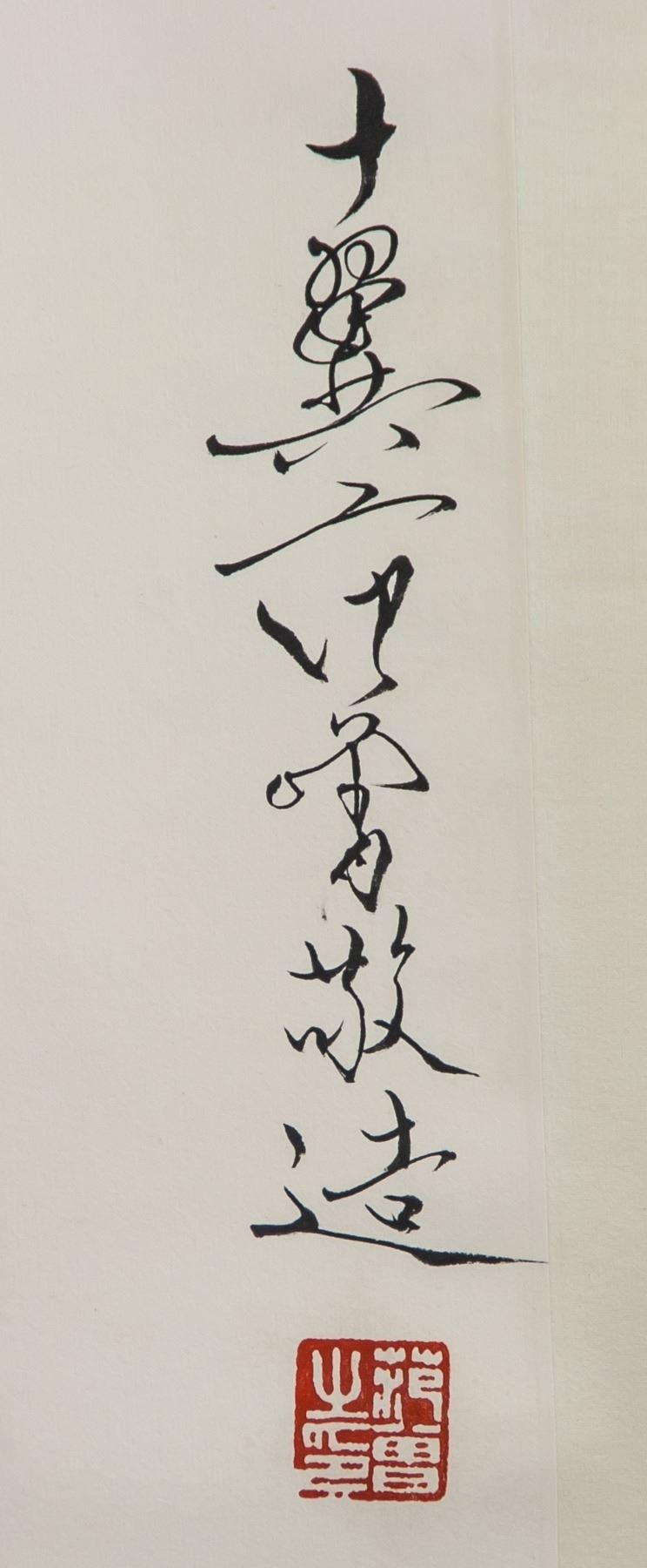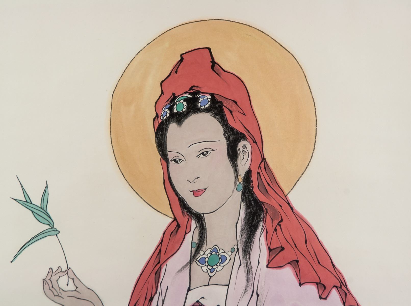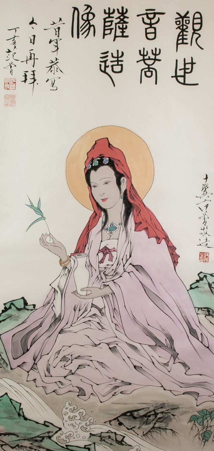 Watercolor and ink on paper, hanging scroll, featuring seated Guanyin, signed and attributed to Fan Zeng (1938- , Chinese), inscribed with 3 artist seals, 135 x 66 cm, Fan Zeng is contemporary Chinese artist known for his mastery of traditional Chinese painting techniques. His works fuse elements of landscape, flower-and-bird, and figure painting, as well as forms of poetry and calligraphy.