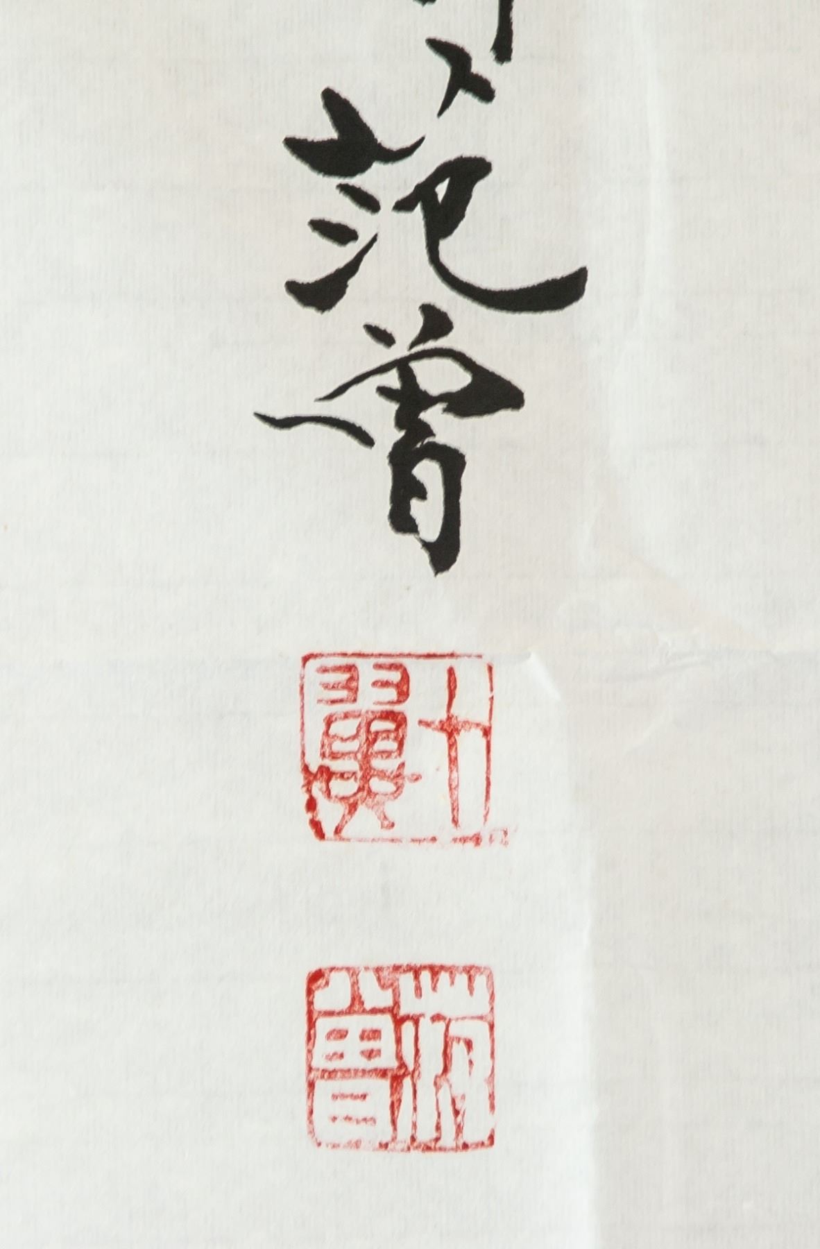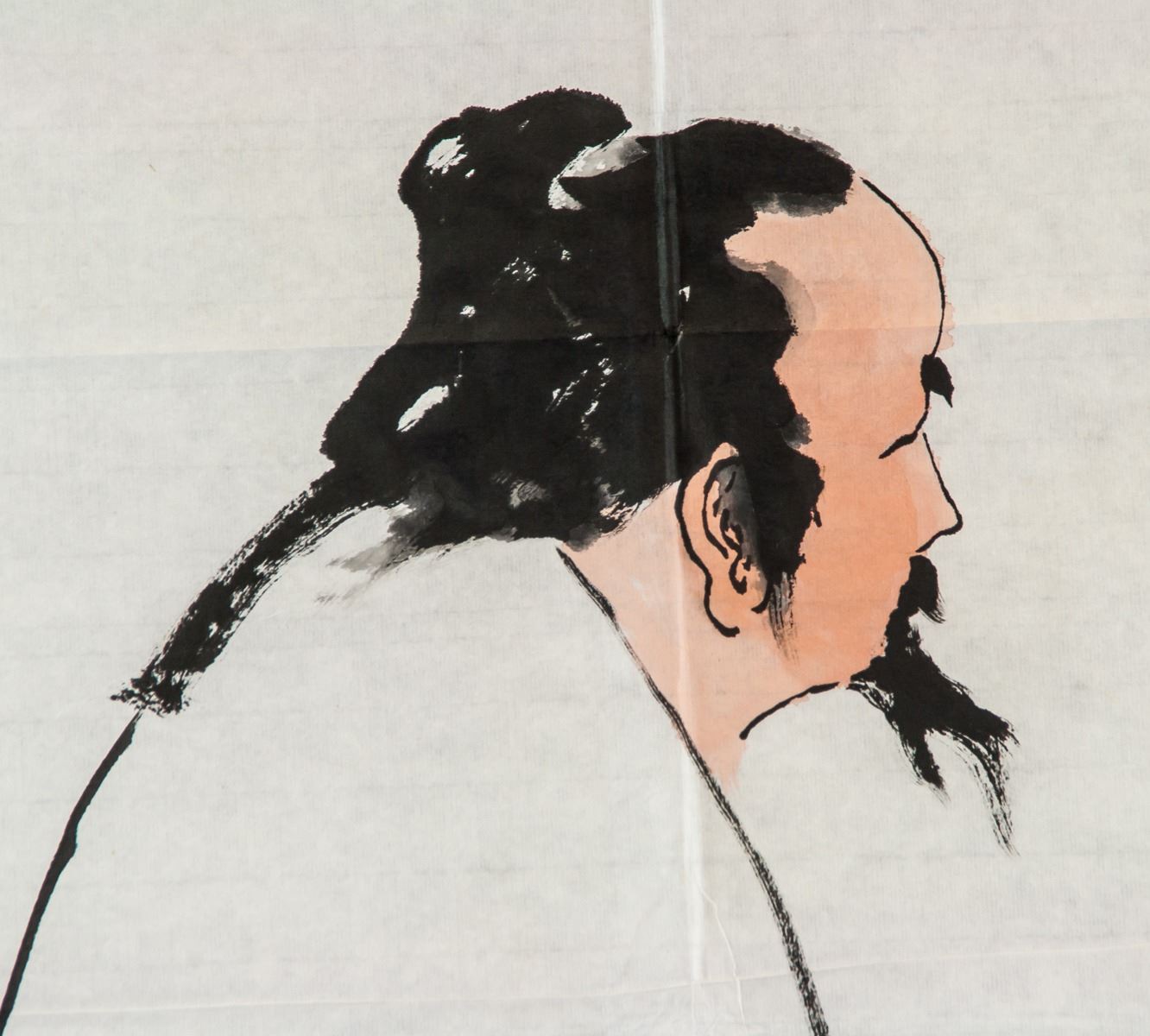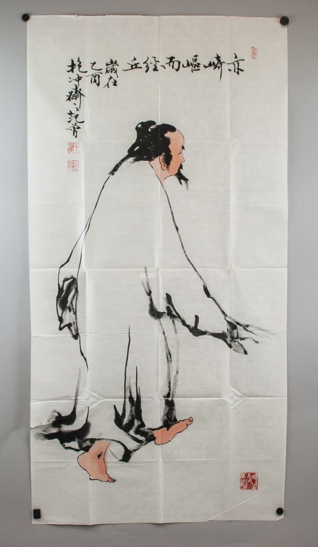 Watercolor and ink on paper, featuring a walking man, signed and attr. Fan Zeng (born 1938, Chinese), inscribed with 3 artist seals, 136 x 69 cm, Fan Zeng is contemporary Chinese artist known for his mastery of traditional Chinese painting techniques. His works fuse elements of landscape, flower-and-bird, and figure painting, as well as forms of poetry and calligraphy. He held solo exhibitions in Japan throughout the 1980s, and participated in various exhibitions in Asia. In addition, he has received numerous awards in design and painting.