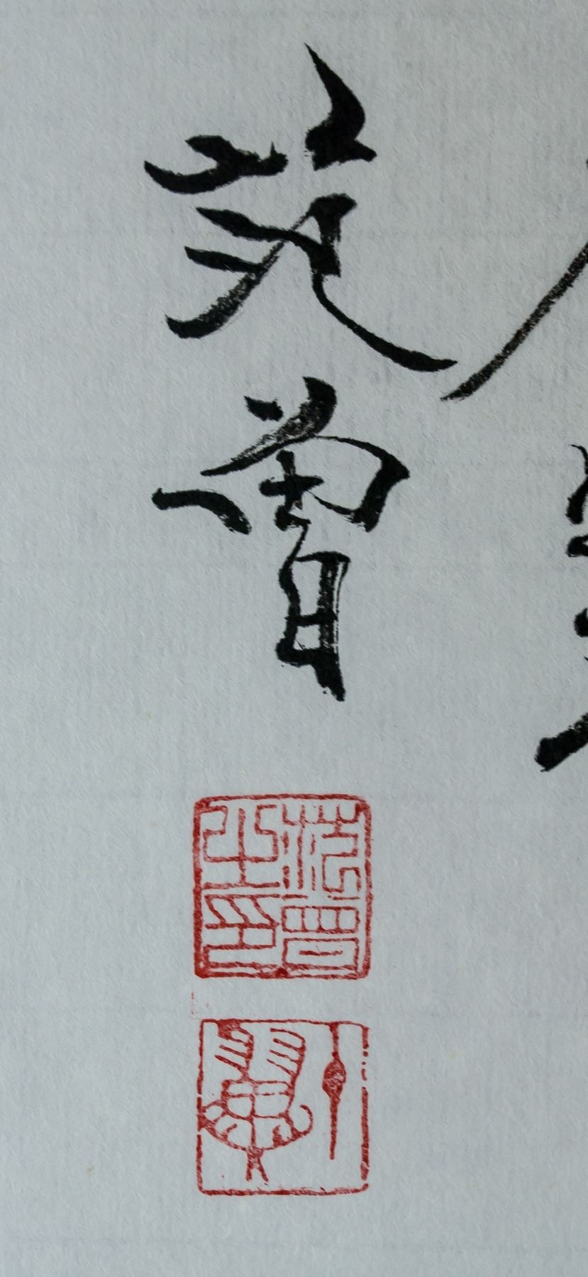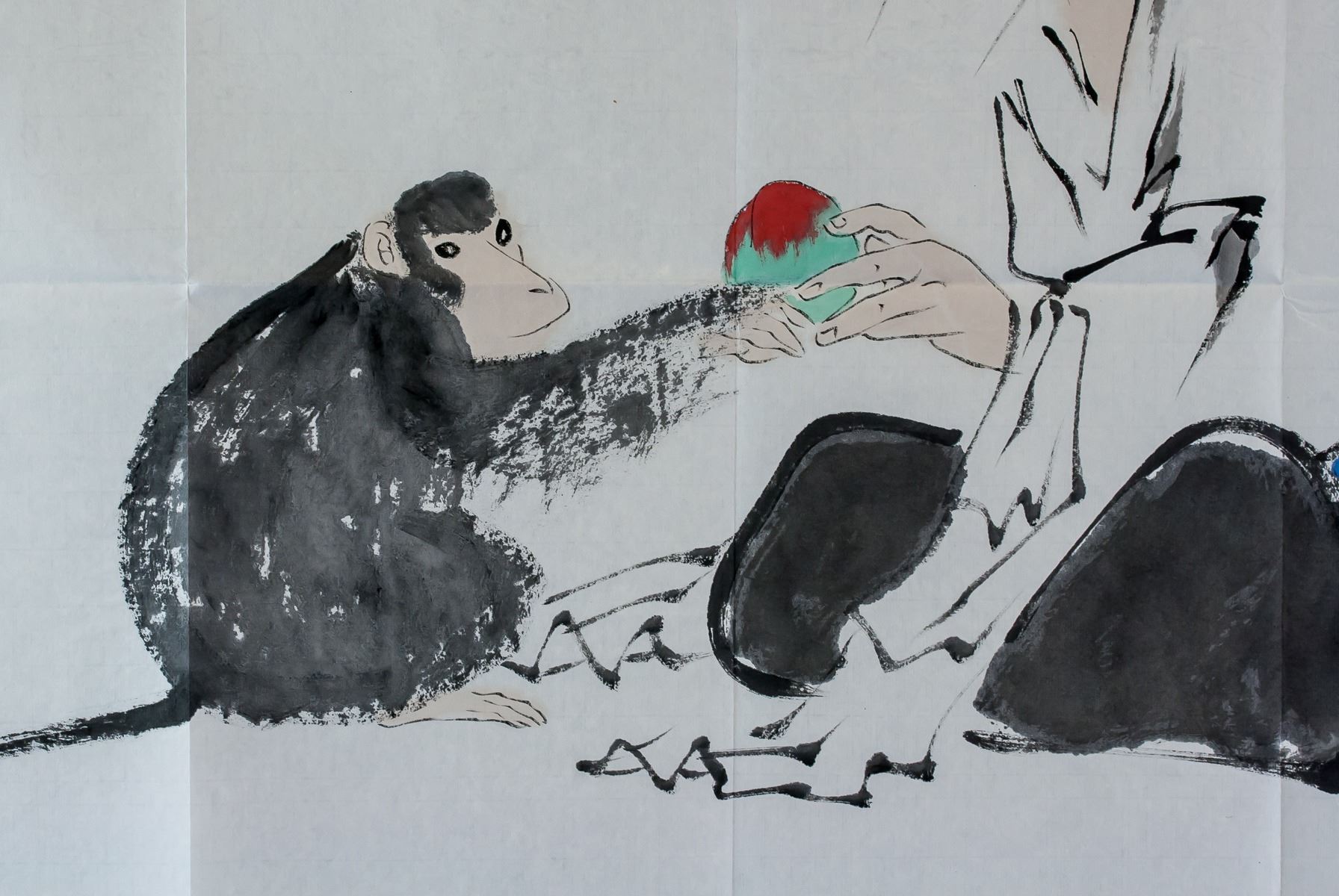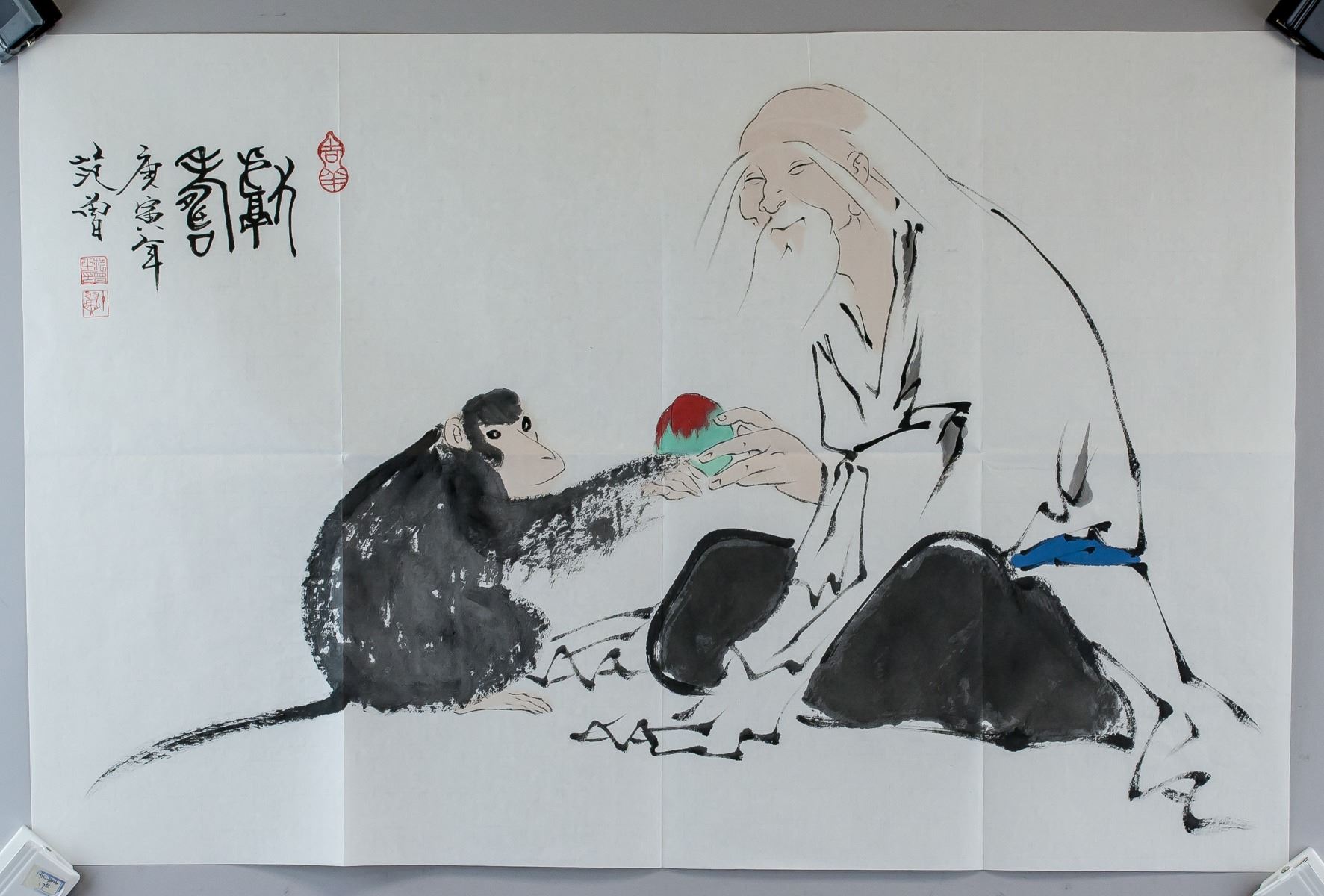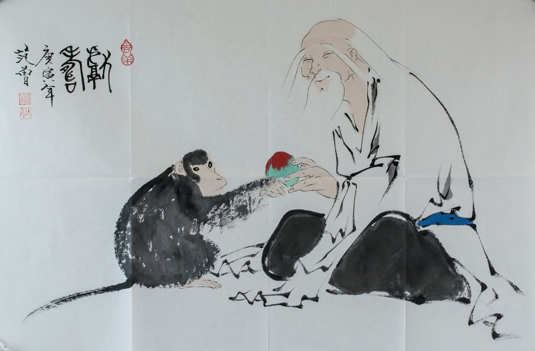 Ink and watercolor on paper. Featuring monkey offering peach to old man. Signed Fan Zeng b.1938 Chinese, inscribed with 3 artist seals. 68.5 x 45 cm