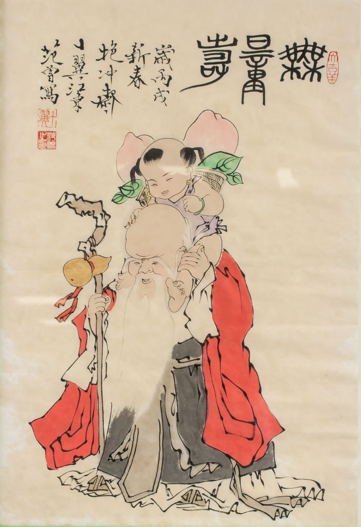 Ink and watercolor on paper, framed. Featuring the Old Man of the South Pole. Signed Fan Zeng (b.1938, Chinese), inscribed with 2 artist seals. 69 x 48 cm