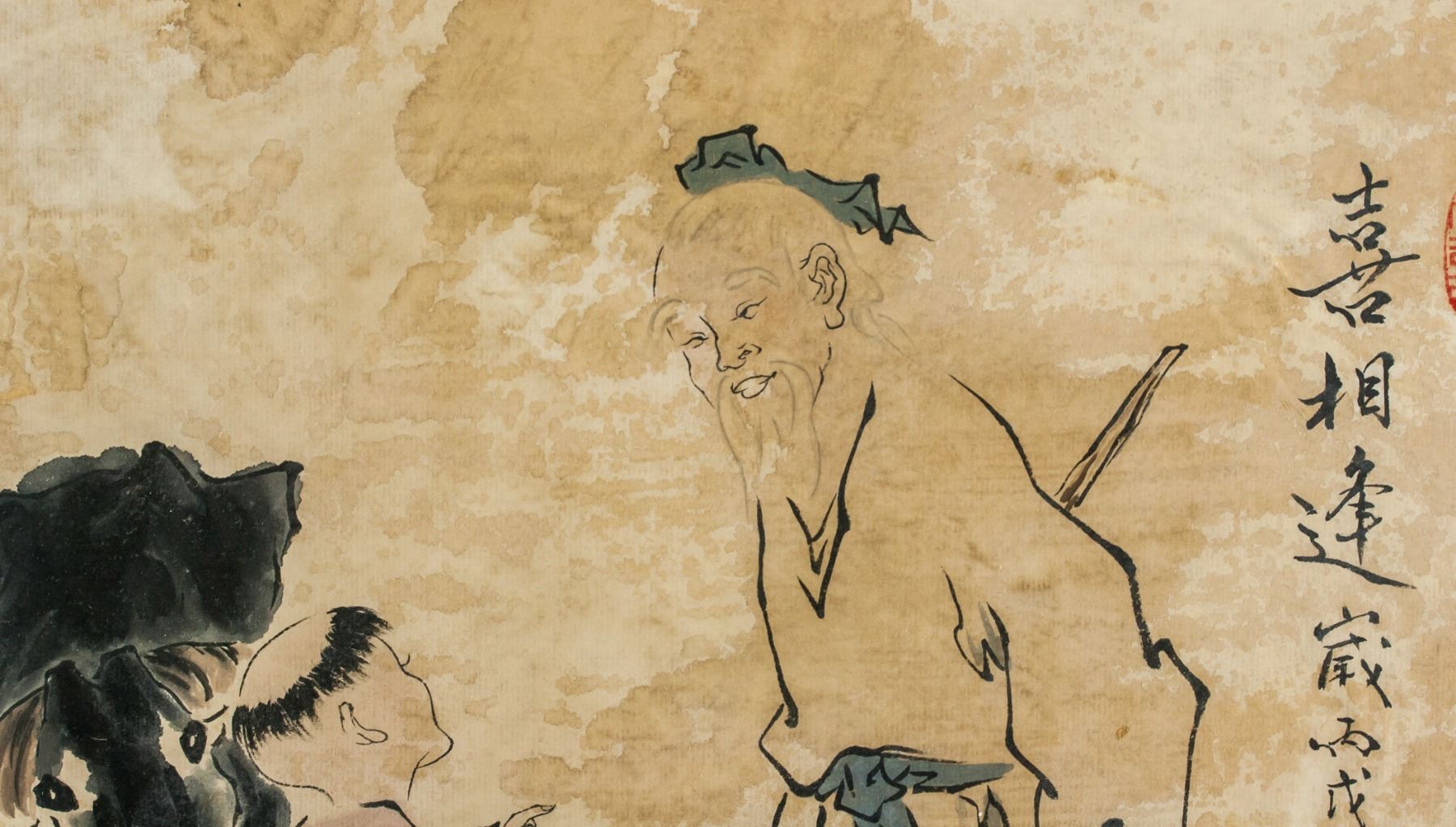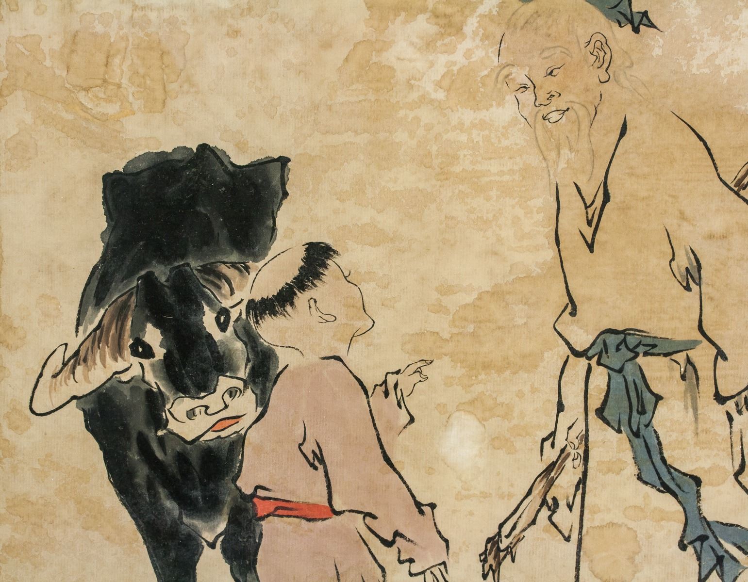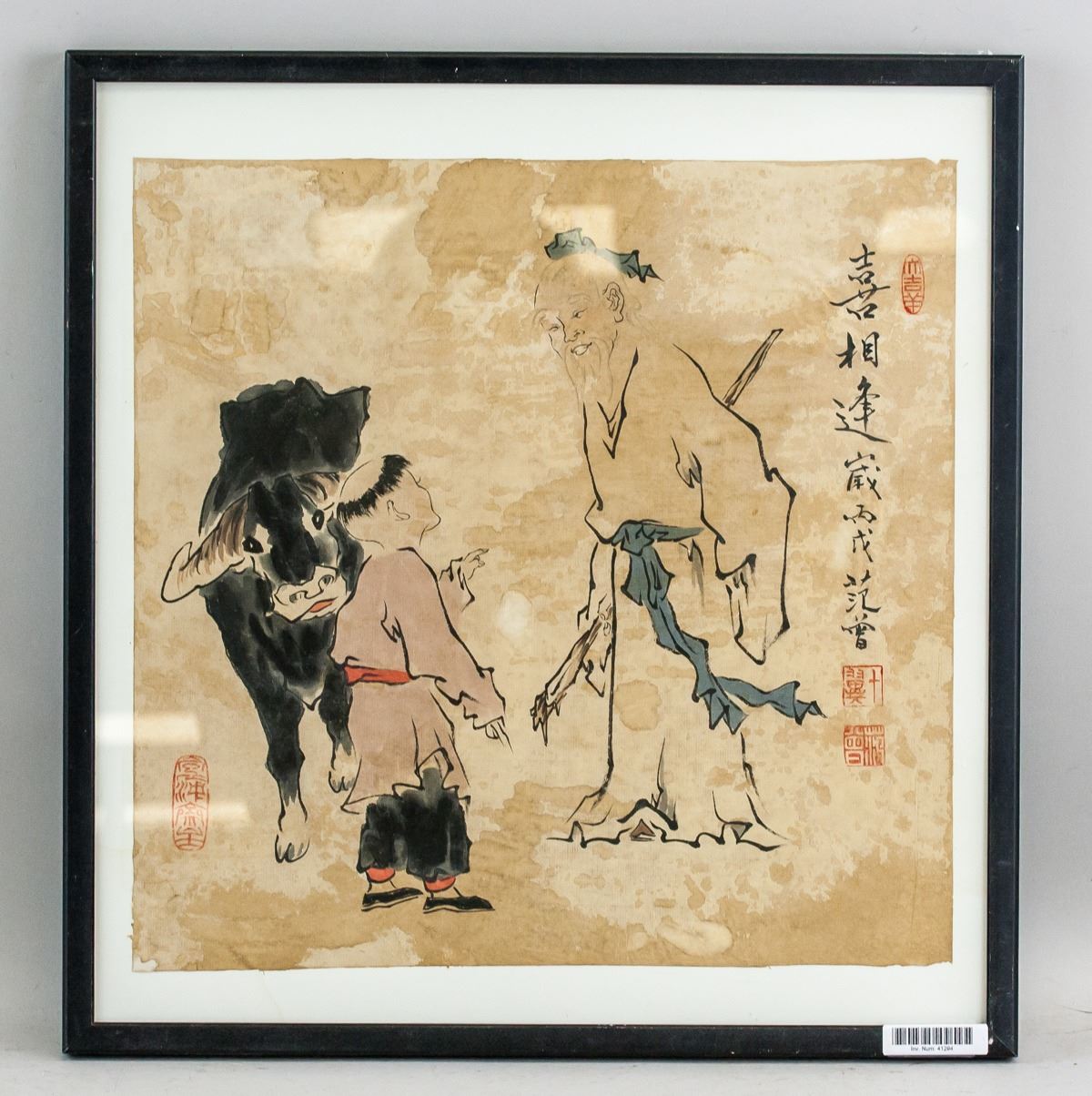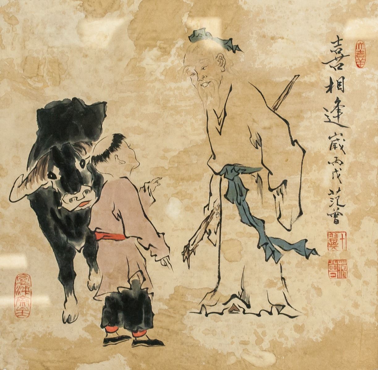 Ink and watercolor on paper, framed. Featuring grandfather and grandson. Signed Fan Zeng b.1938 Chinese, inscribed with 4 artist name.35 x 34 cm