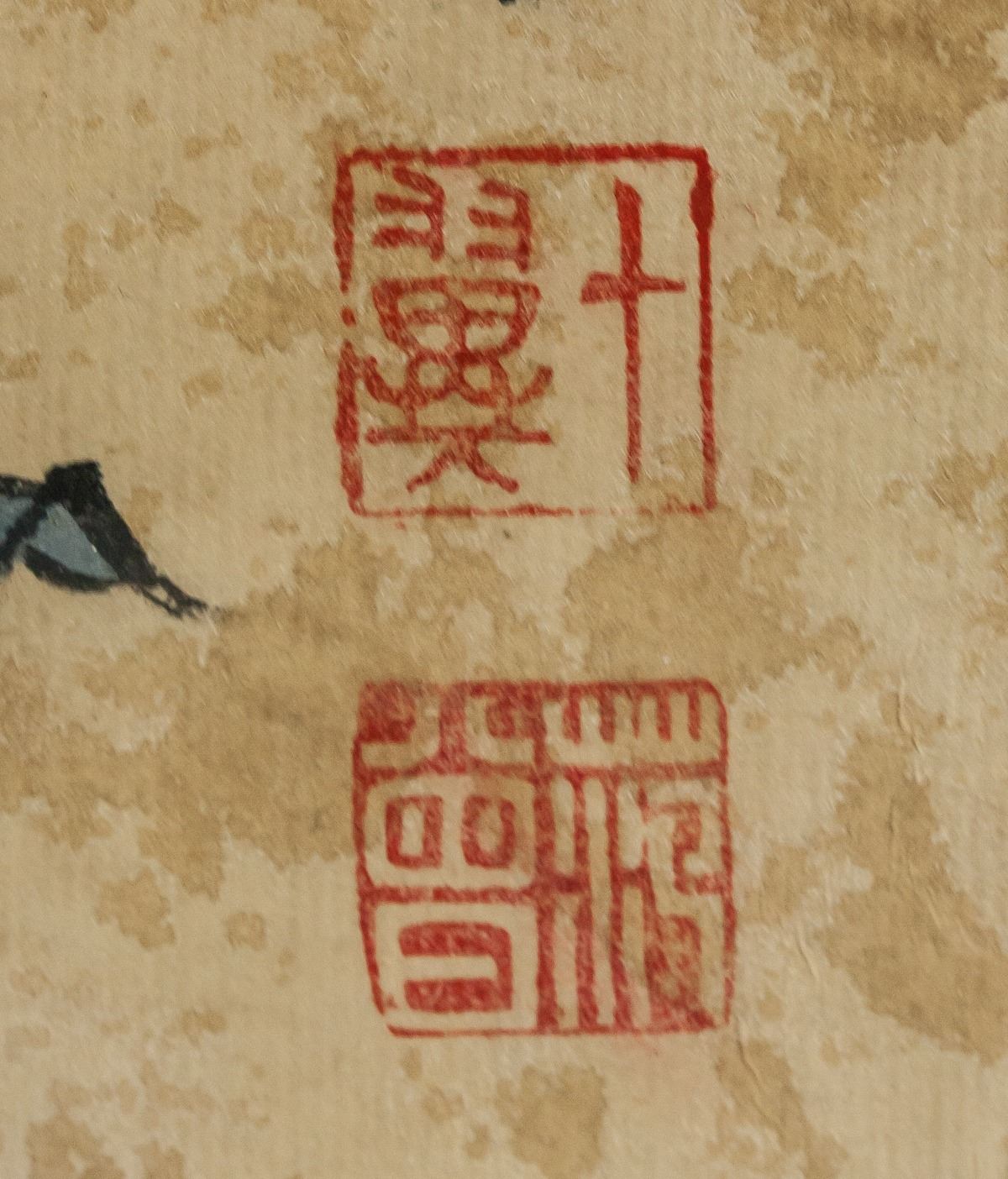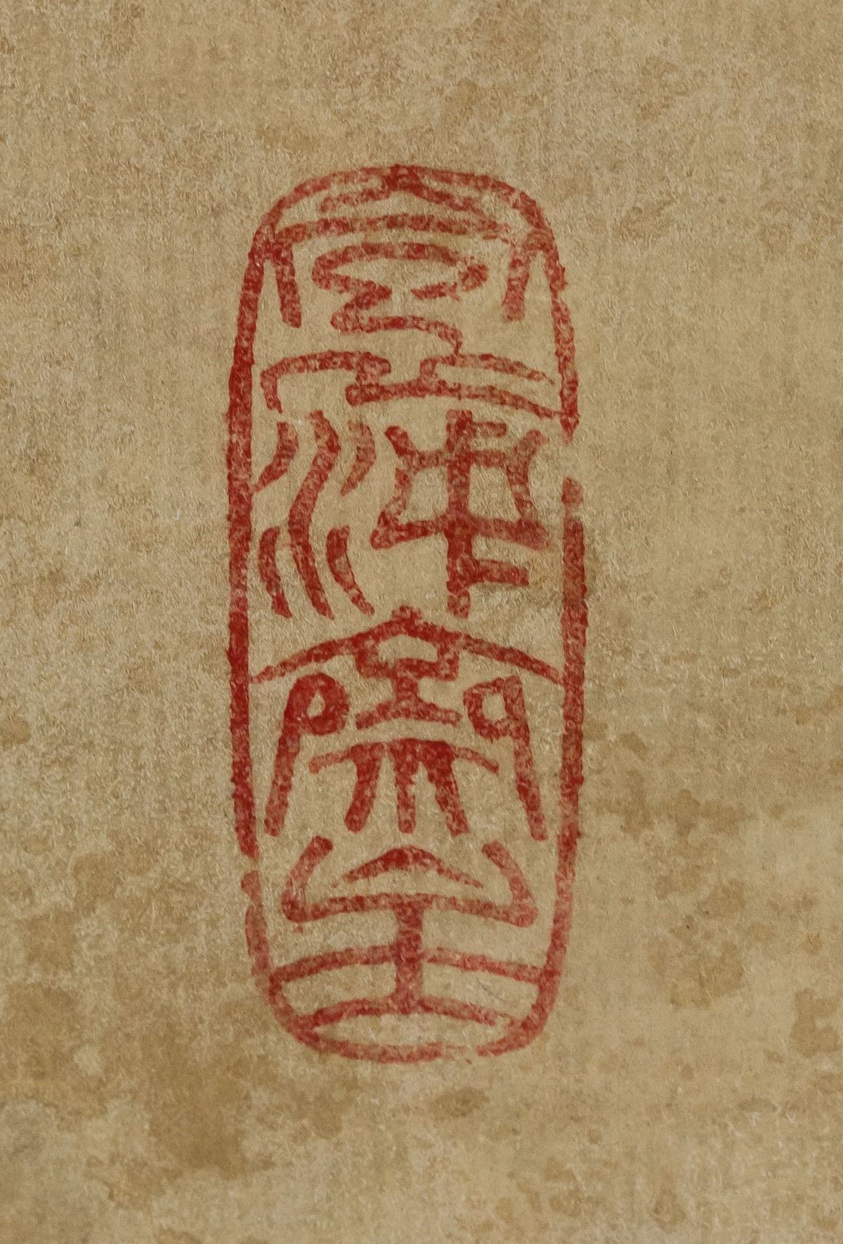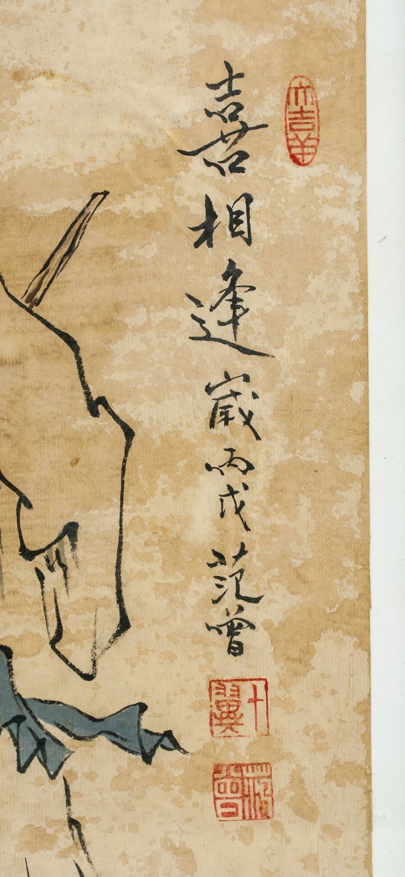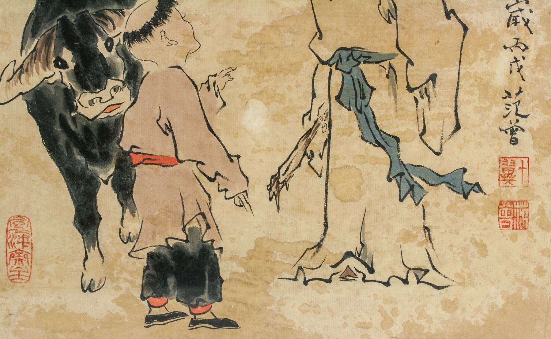 Ink and watercolor on paper, framed. Featuring grandfather and grandson. Signed Fan Zeng b.1938 Chinese, inscribed with 4 artist name.35 x 34 cm