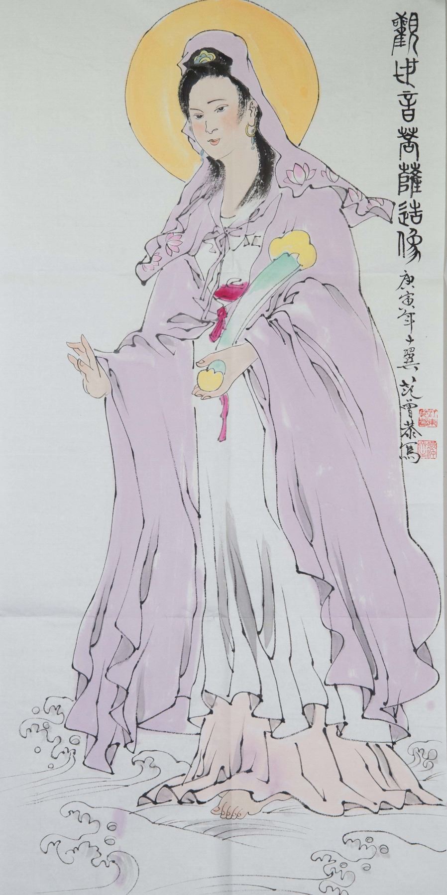 Ink and watercolor on paper. Featuring Gwanyin holding a ruyi. Signed and attributed to Fan Zeng (Chinese, born 1938) and inscribed with two artist seals. 98 x 45 cm
