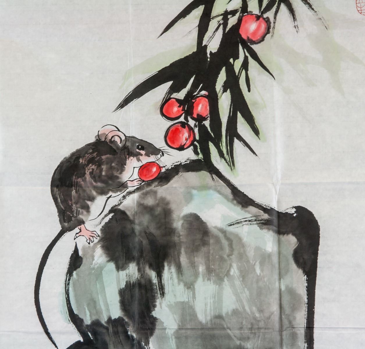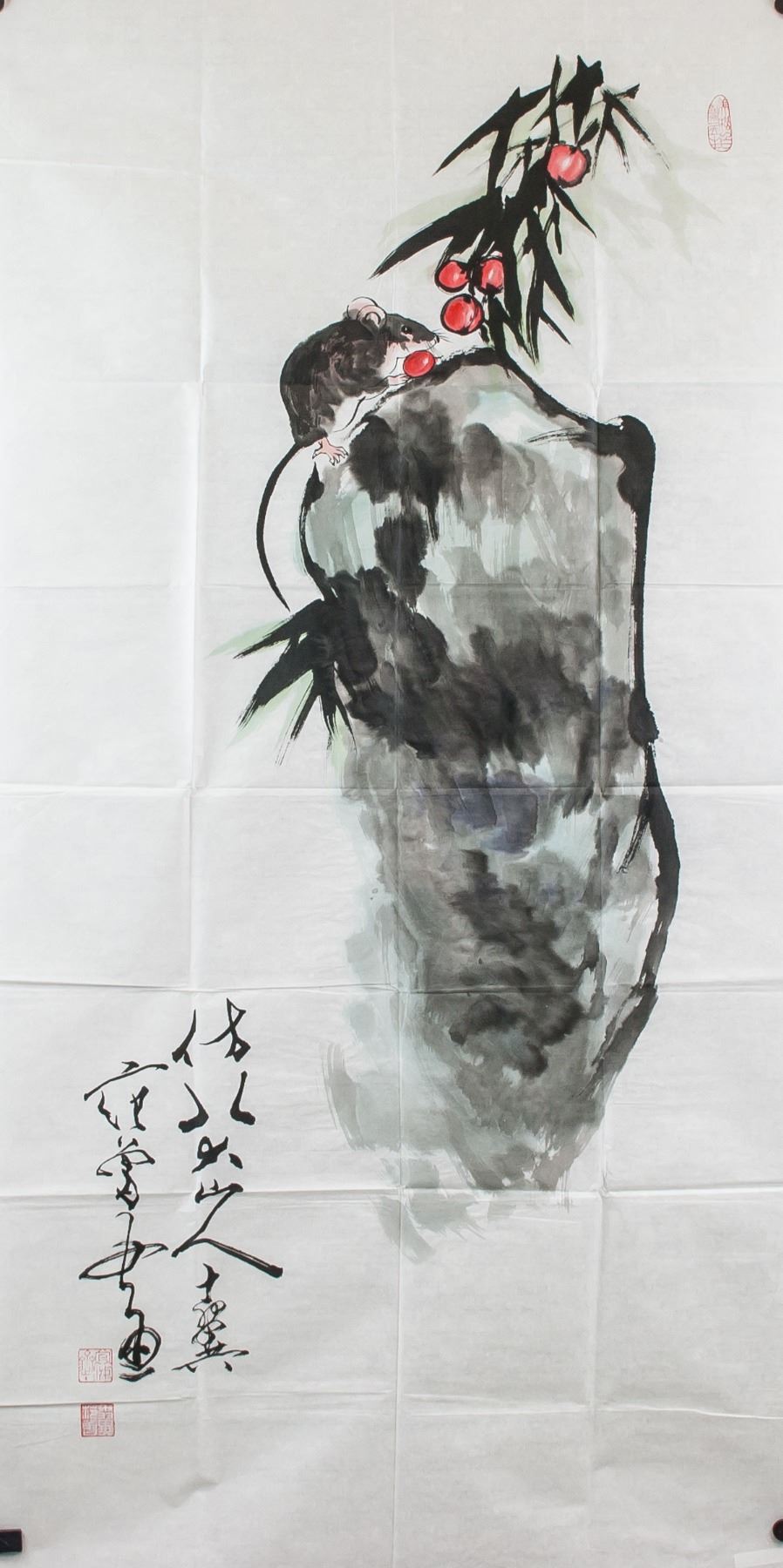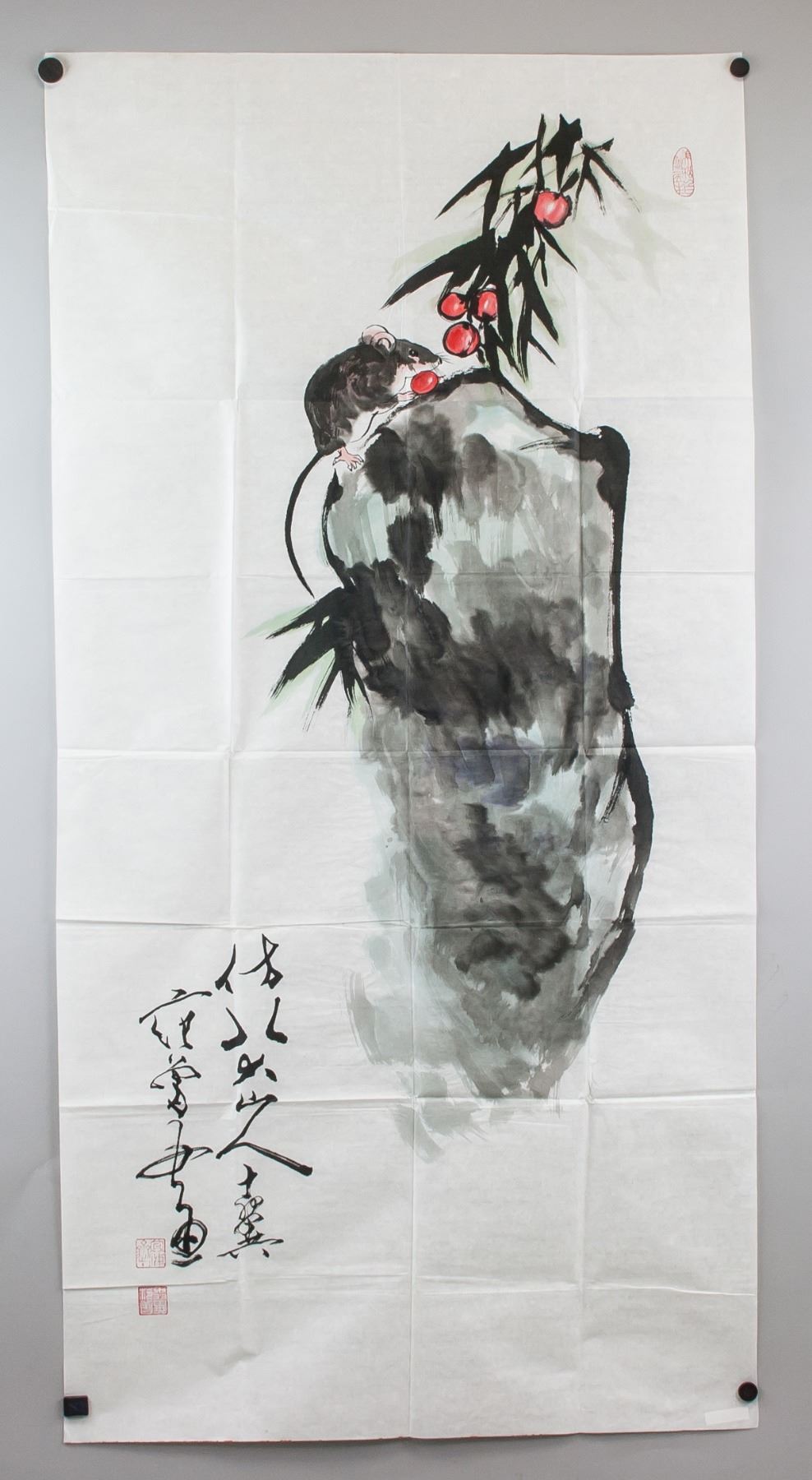 Watercolor and ink on paper, featuring a rat eating fruits, signed and attr. Fan Zeng (Chinese, b.1938), inscribed with 3 artist seals, 137 x 69 cm, Fan Zeng is contemporary Chinese artist known for his mastery of traditional Chinese painting techniques. His works fuse elements of landscape, flower-and-bird, and figure painting, as well as forms of poetry and calligraphy. He held solo exhibitions in Japan throughout the 1980s, and participated in various exhibitions in Asia. In addition, he has received numerous awards in design and painting.