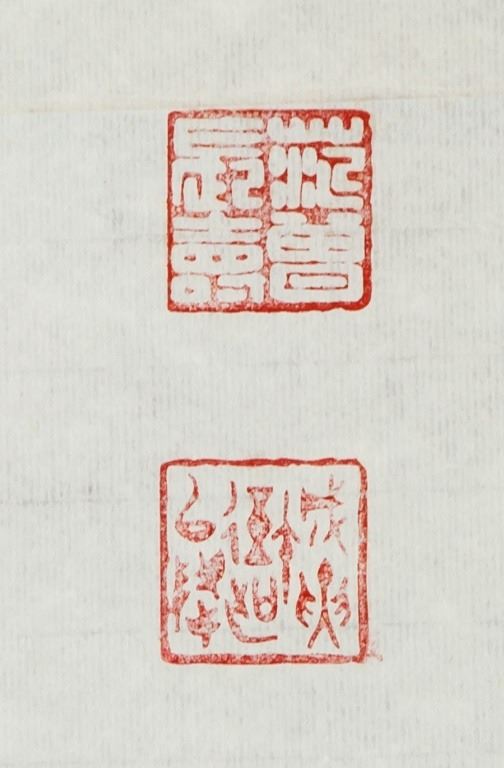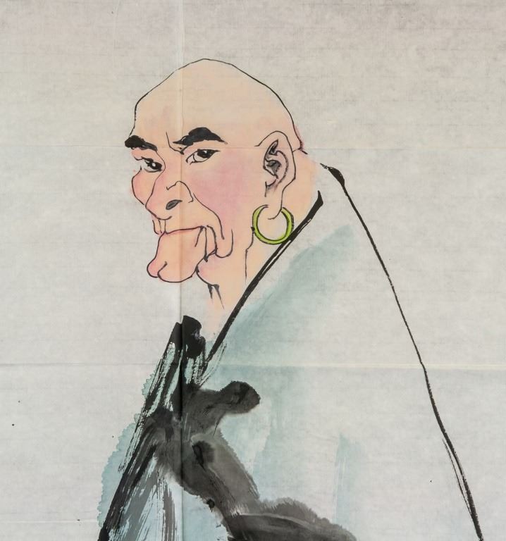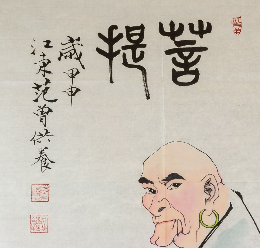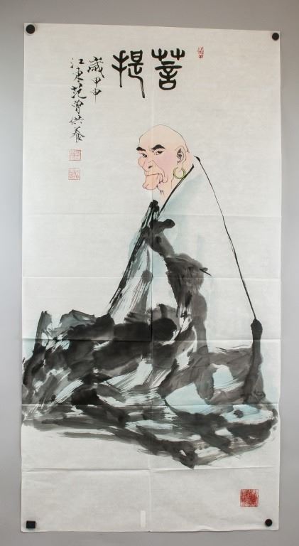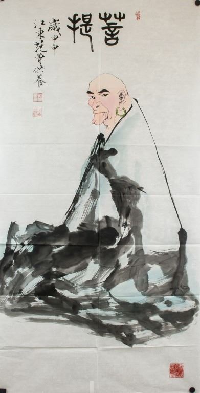 Watercolor and ink on paper, featuring a Bodhidharma, signed and attr. Fan Zeng (b.1938, Chinese). Inscribed with 4 artist seals. 137 x 70 cm. Fan Zeng is contemporary Chinese artist known for his mastery of traditional Chinese painting techniques. His works fuse elements of landscape, flower-and-bird, and figure painting, as well as forms of poetry and calligraphy. He held solo exhibitions in Japan throughout the 1980s, and participated in various exhibitions in Asia. In addition, he has received numerous awards in design and painting.