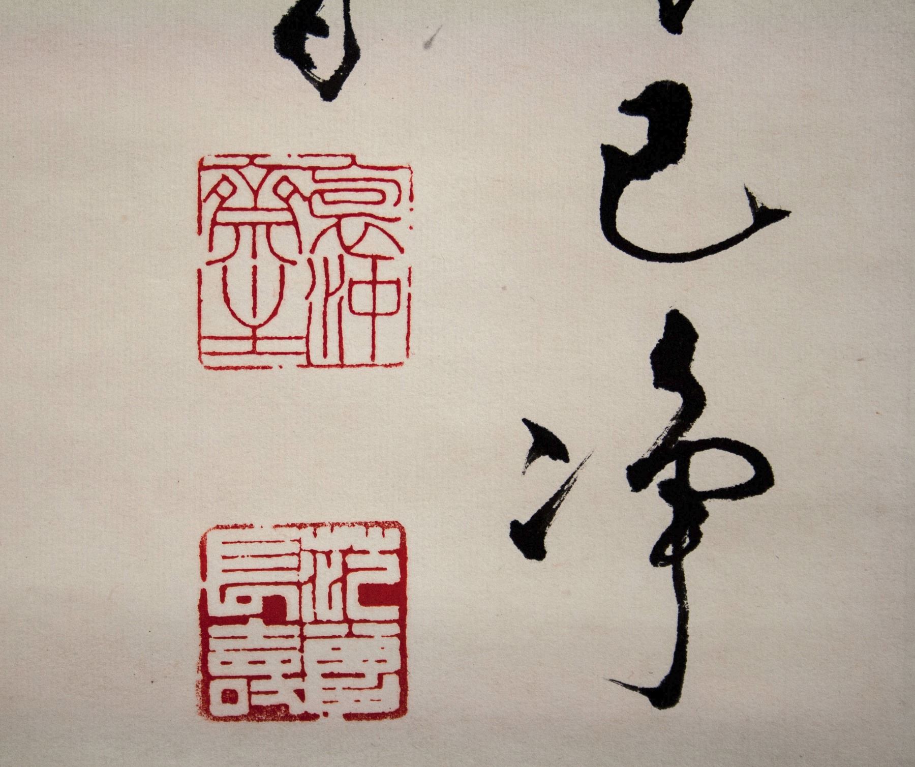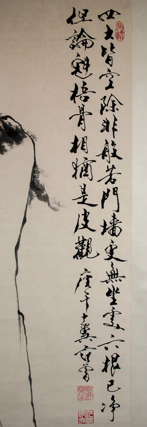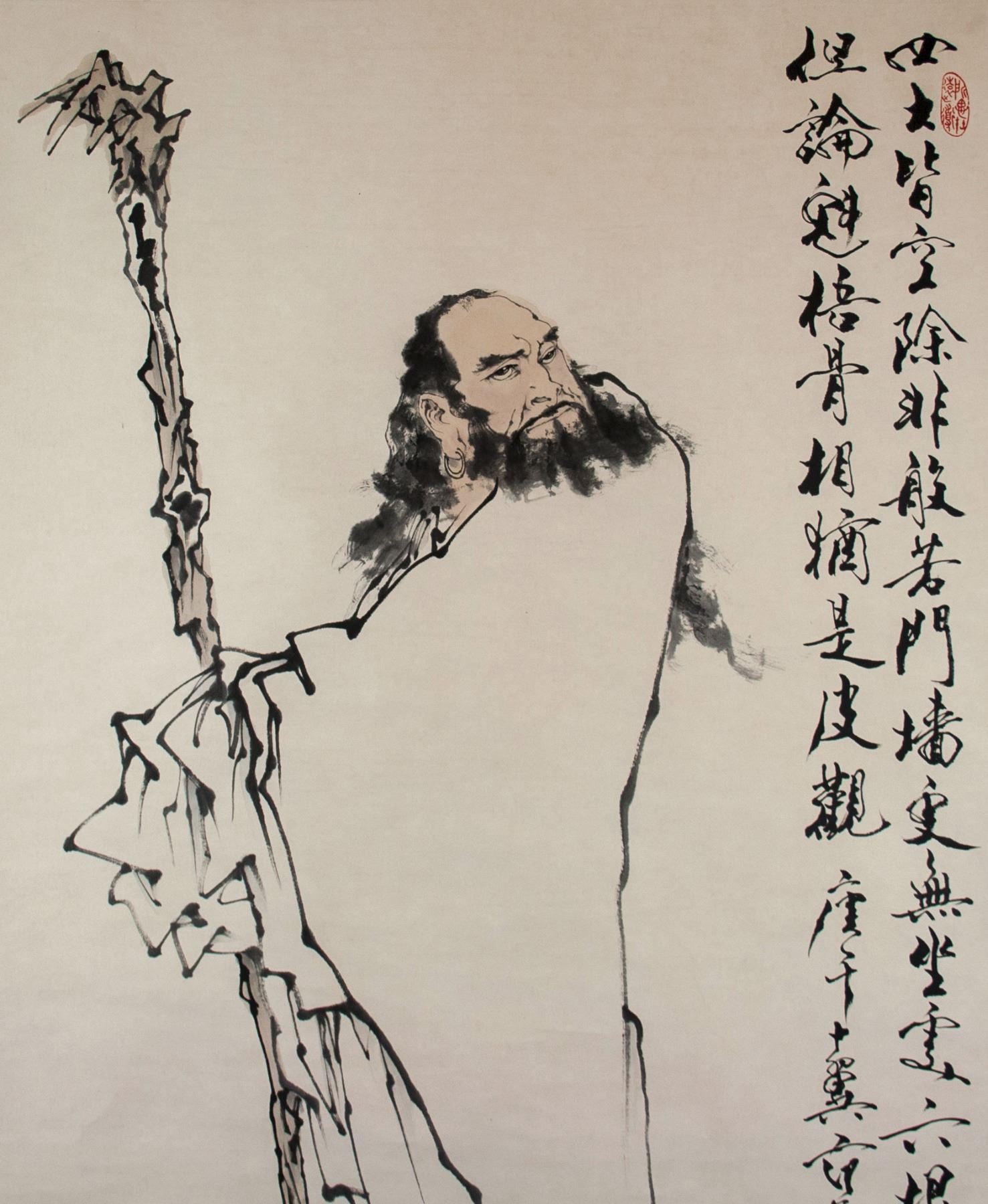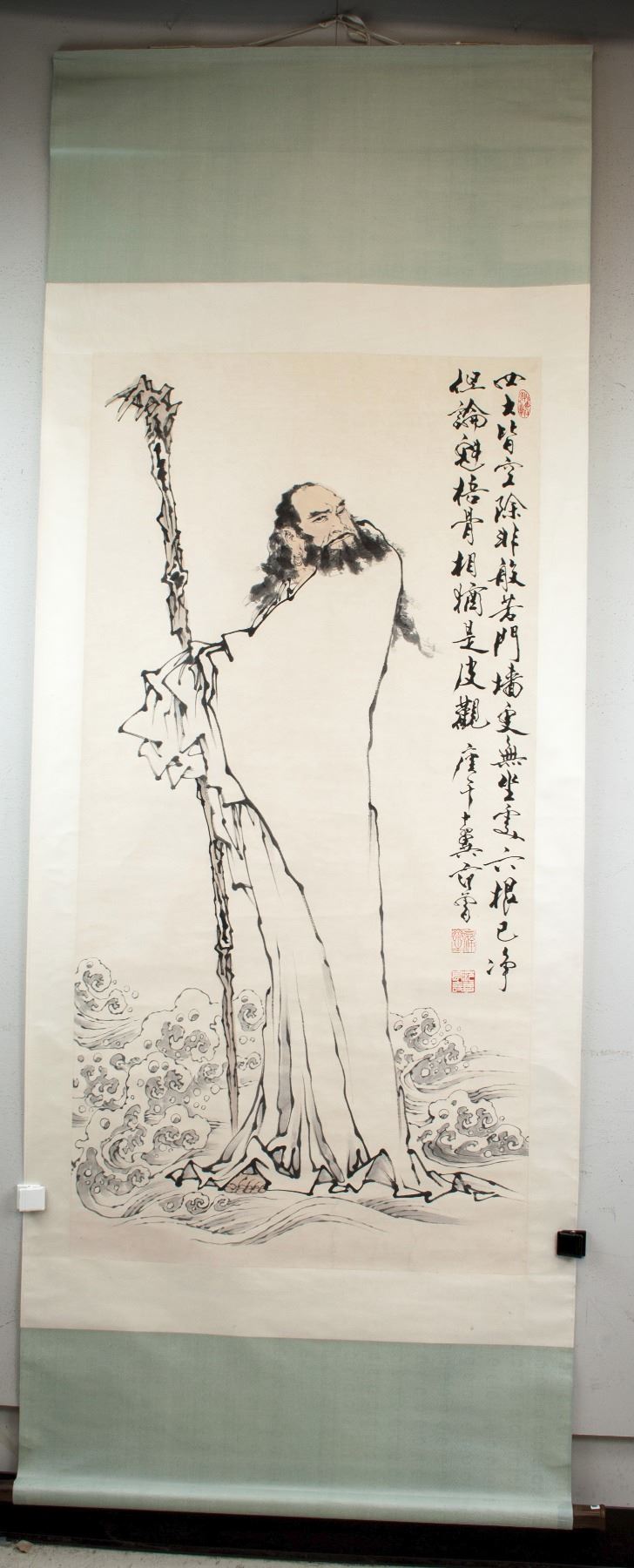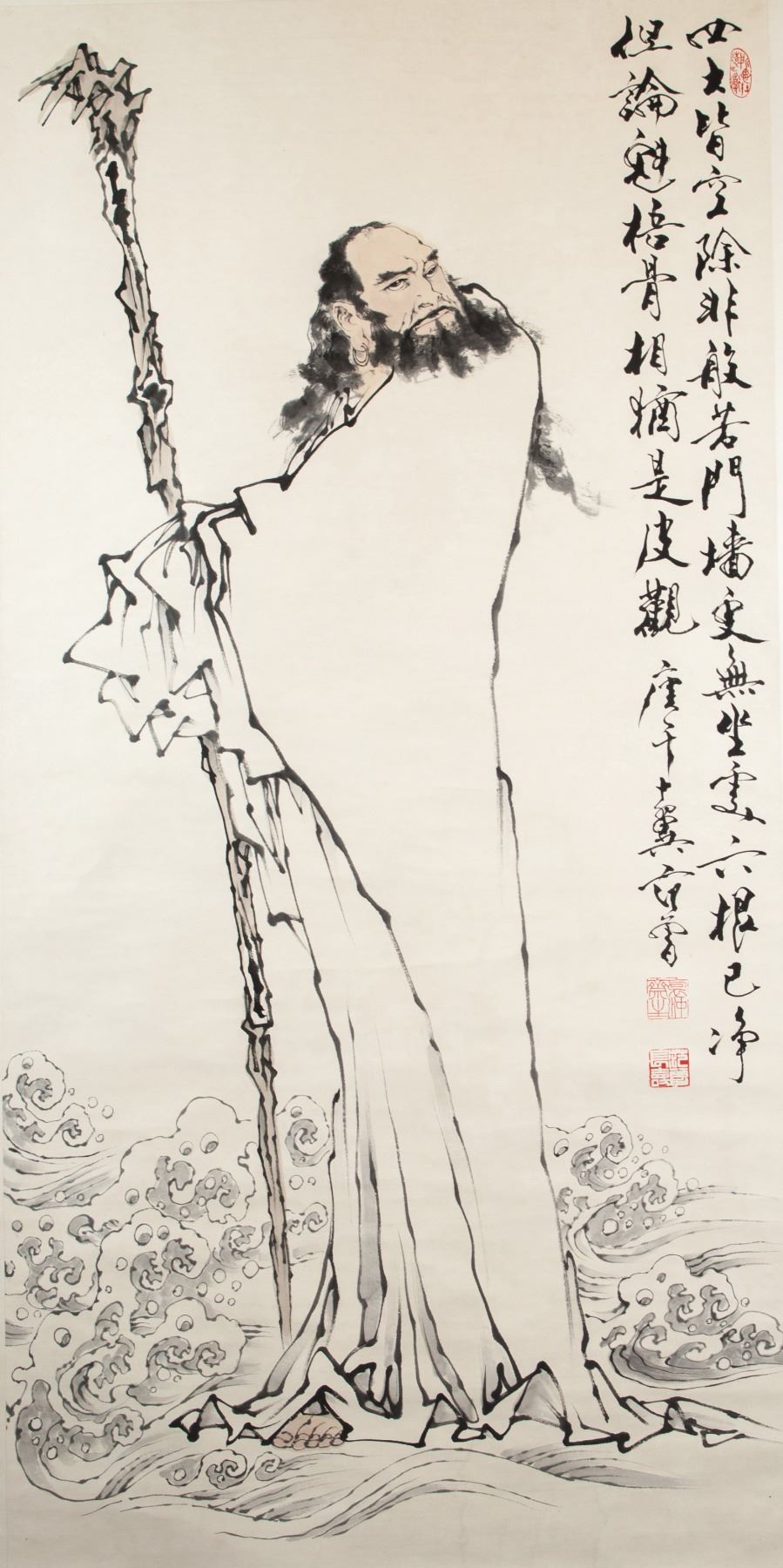 Painting of Bodhidharma crossing the sea; Chinese ink and watercolour on paper; hanging scroll; signed Fan Zeng (b.1938); inscribed with 2 artist seals; 138 cm x 65 cm