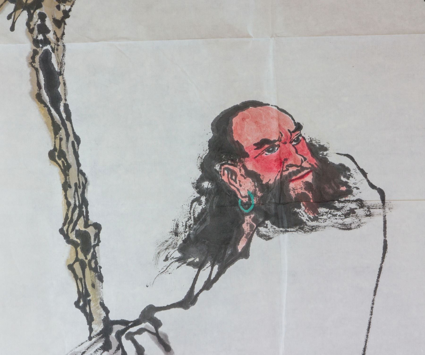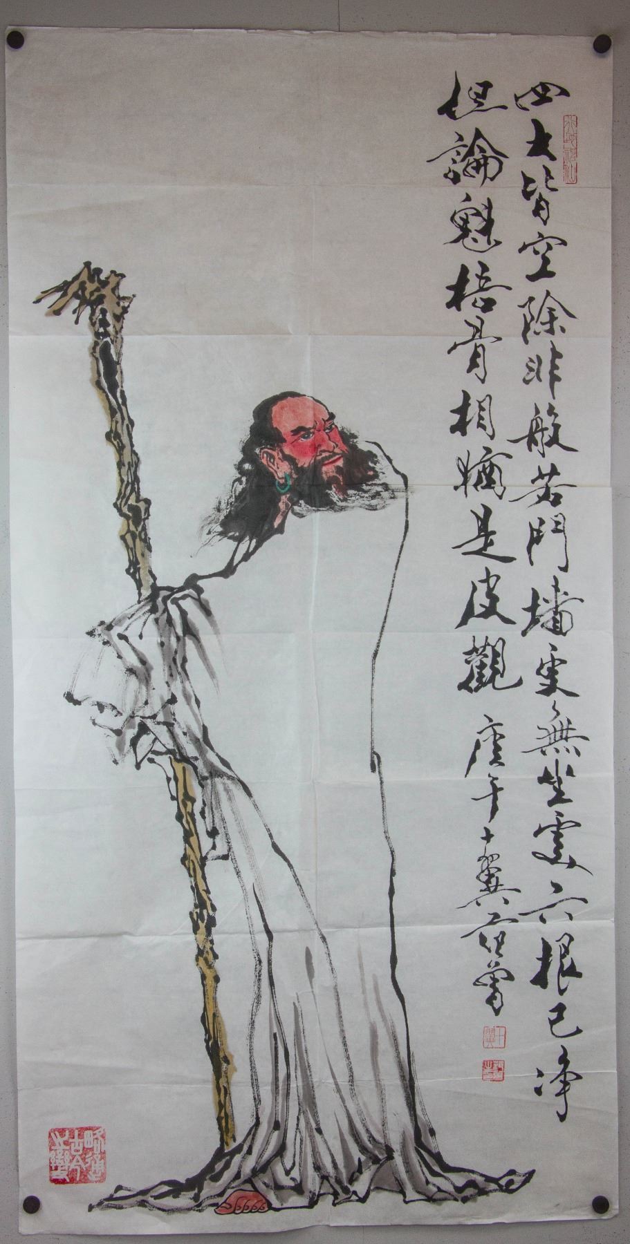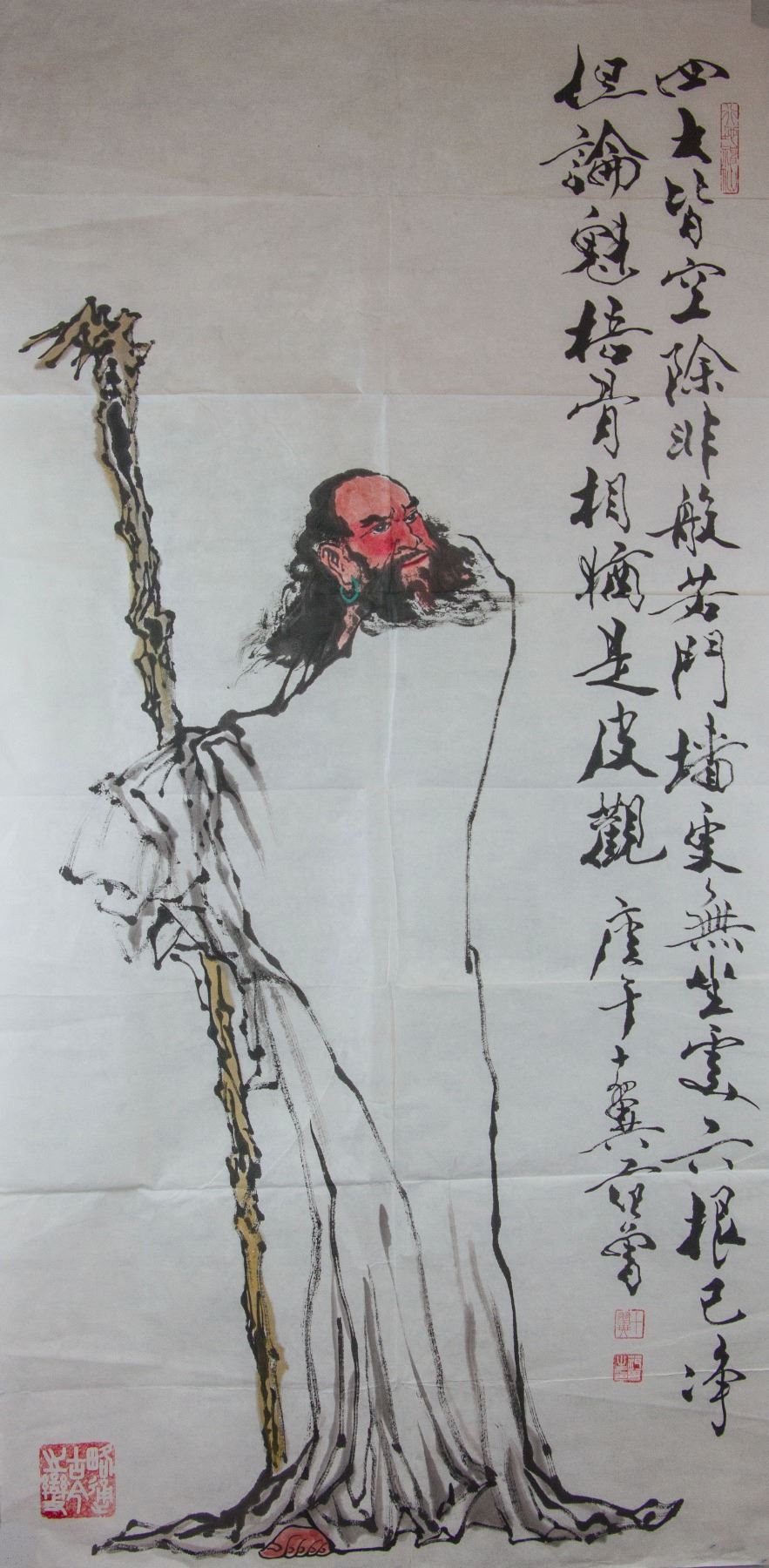 Painting of standing Bodhidharma; Chinese ink and watercolour on paper; signed Fan Zeng (b.1938); inscribed with 4 artist seals; 128 cm x 69 cm