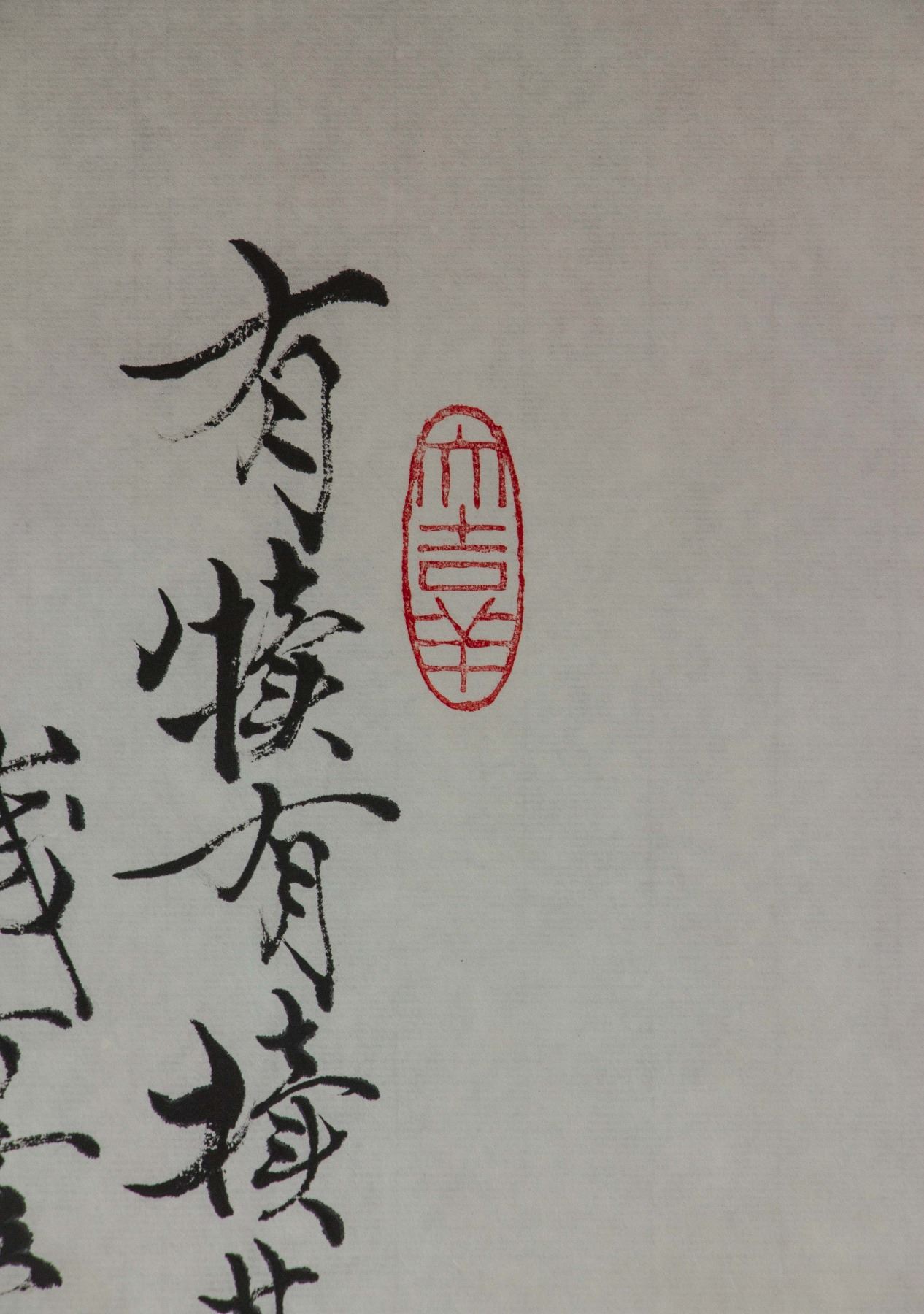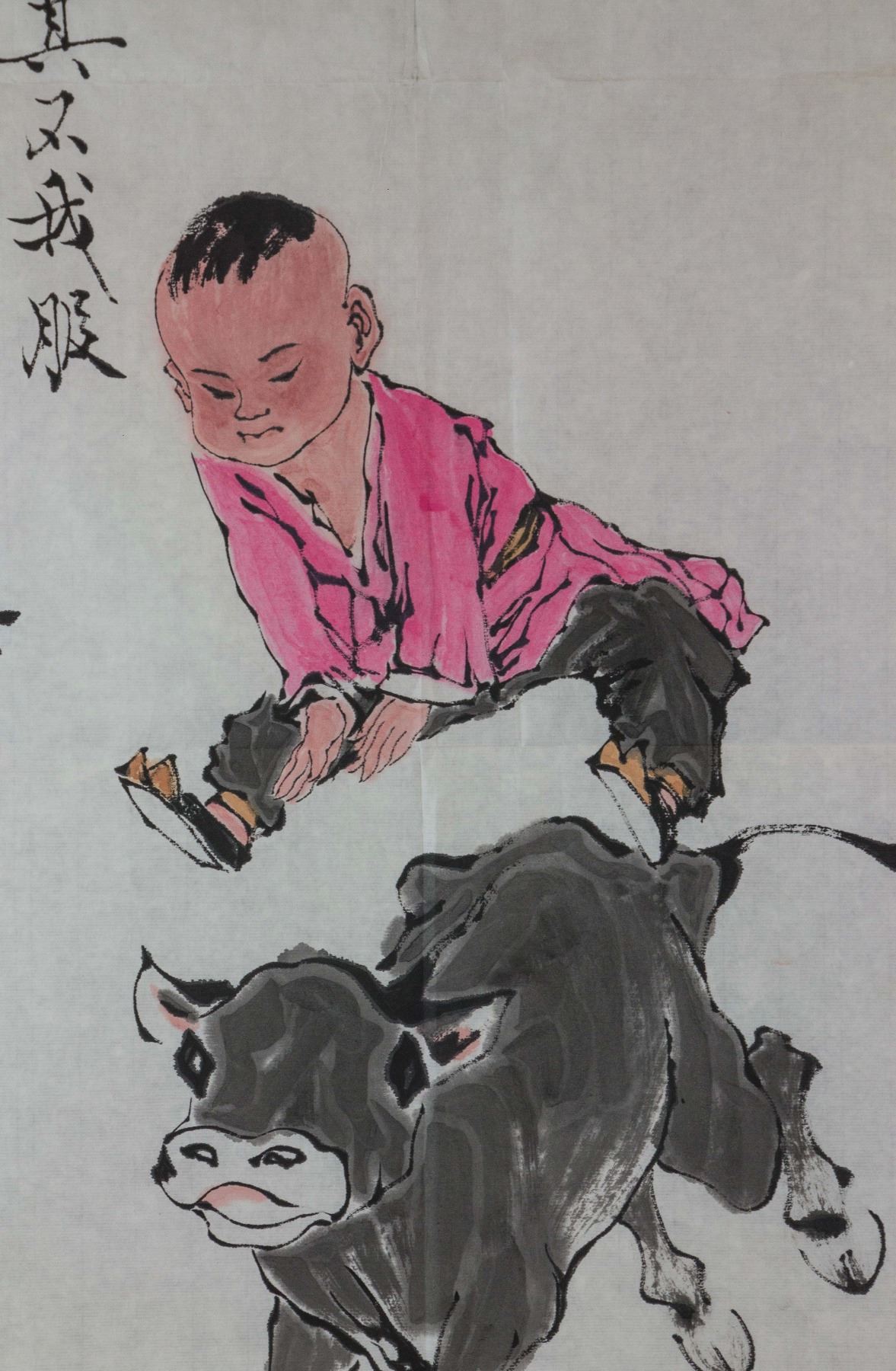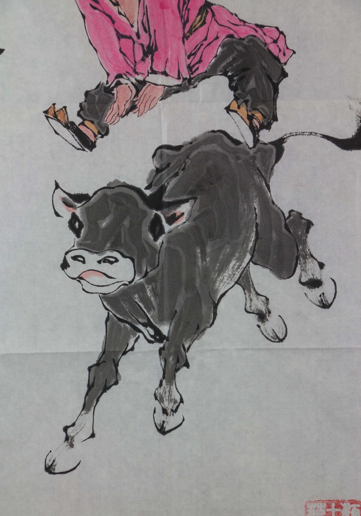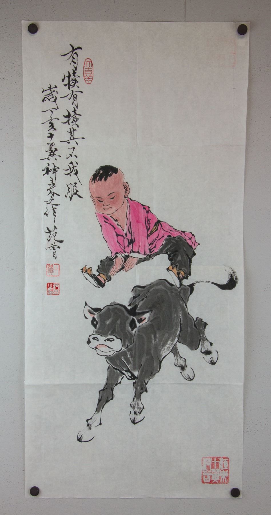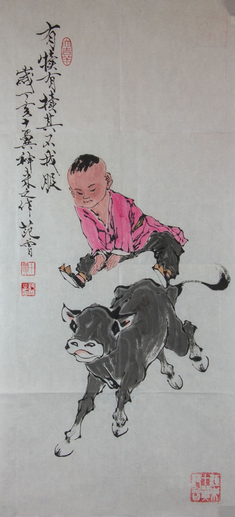 Boy jumping over a running cow; Chinese ink and watercolour on paper; signed Fan Zeng (b.1938); inscribed with signed 4 artist seals; 96 cm x 45 cm