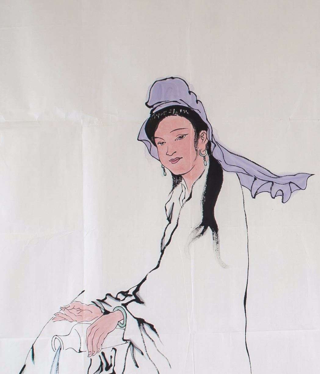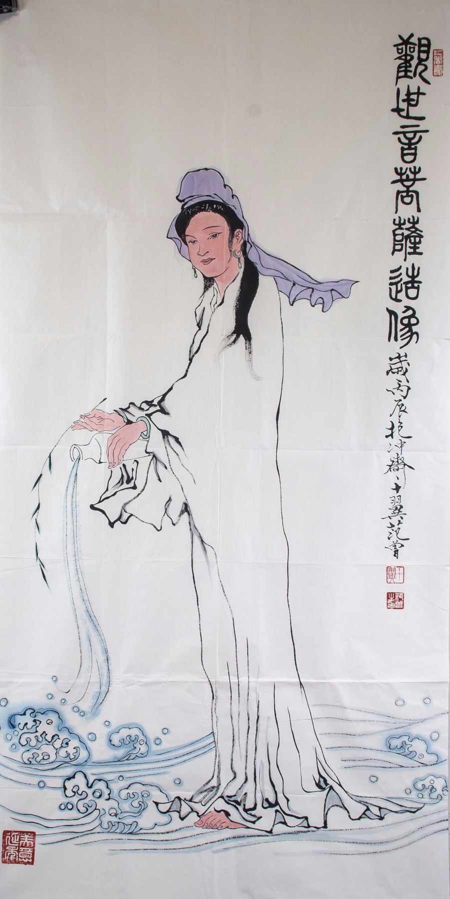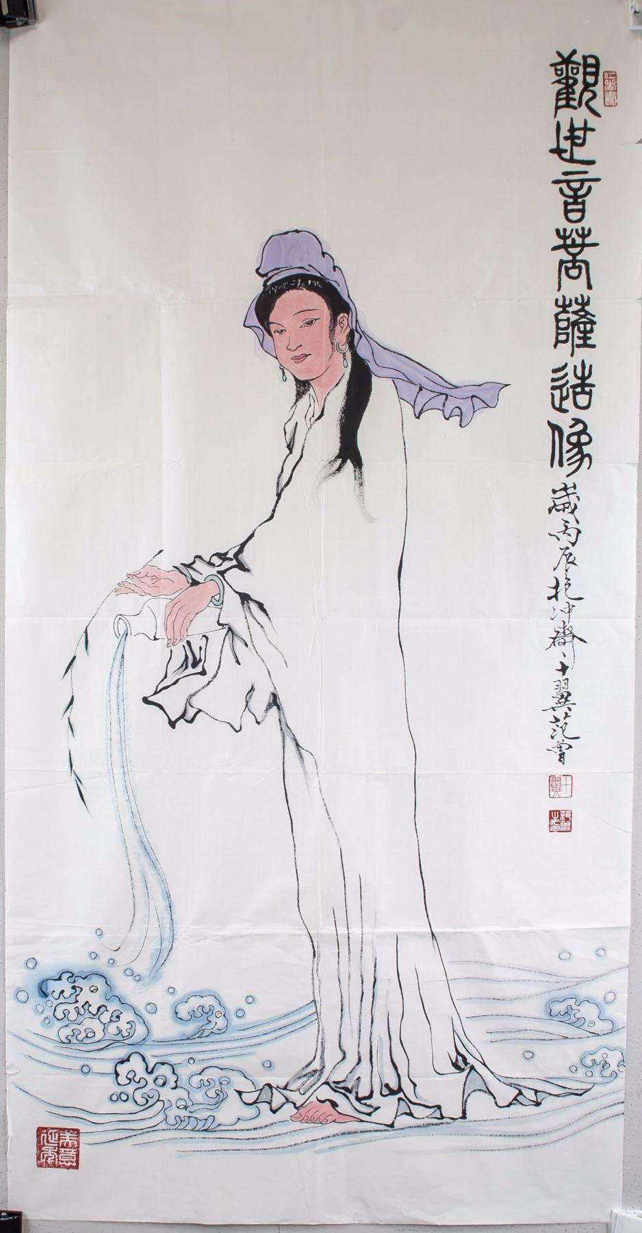 Painting of standing Guanyin with Jinping vase; Chinese ink and watercolour on paper; signed Fan Zeng (b.1938), Chinese painter and calligrapher; inscribed with 4 artist seals; 136 cm x 69 cm