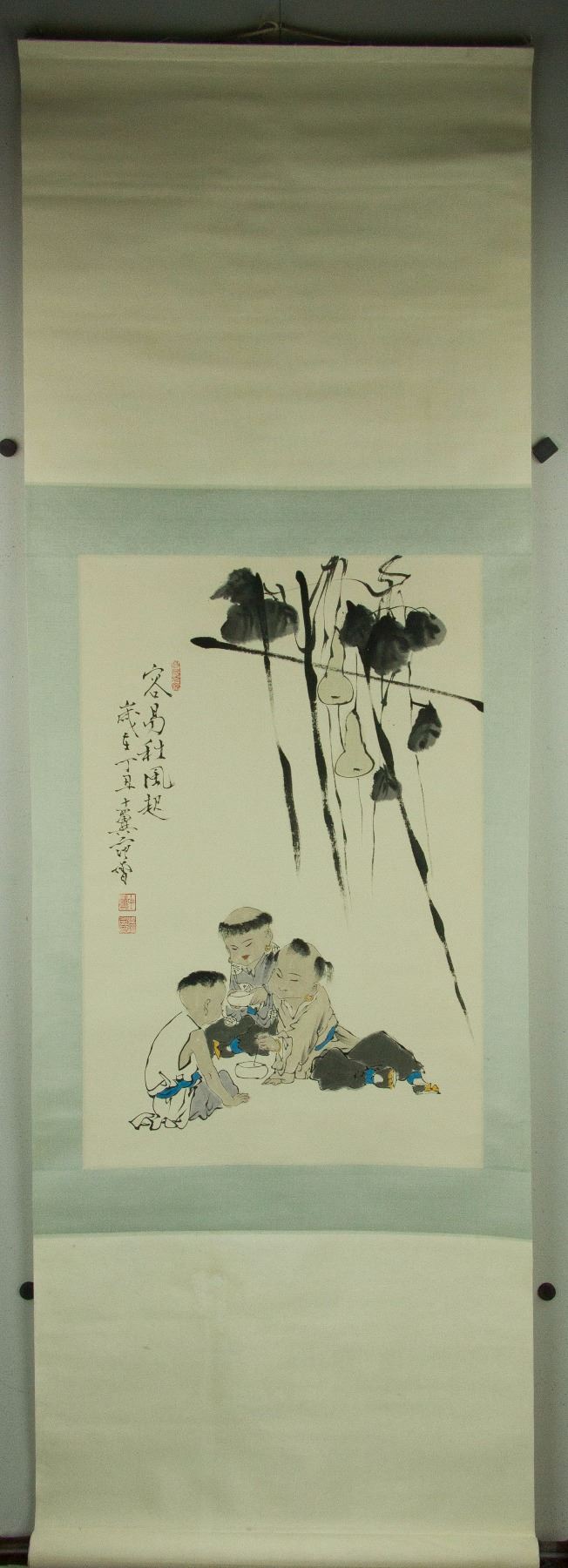 Boys at leisure under calabash vines; Chinese ink and watercolour on paper; hanging scroll; signed Fan Zeng and inscribed with three artist seals; 165 cm × 54 cm