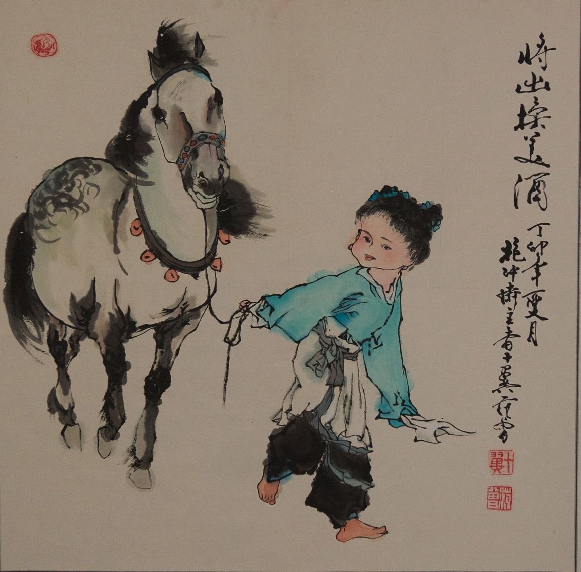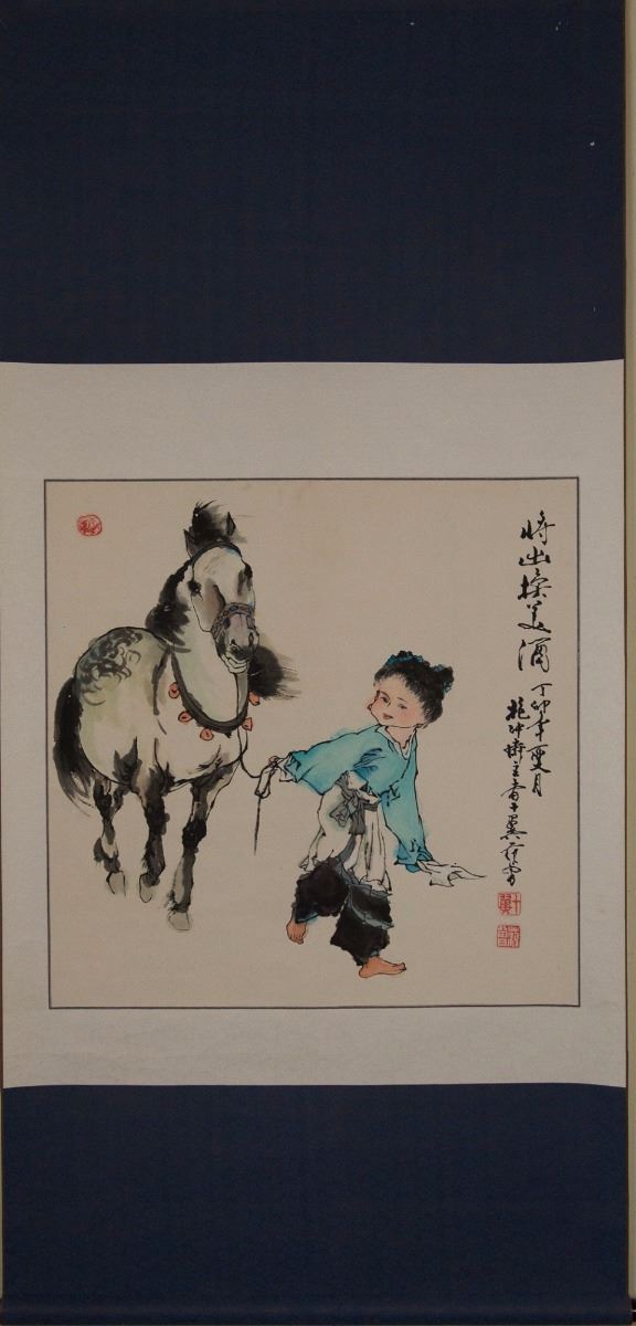 Child and horse, hanging scroll, Chinese ink and watercolour on paper, signed Fan Zeng (1938-) with three red seals. 68 cm x 68 cm.