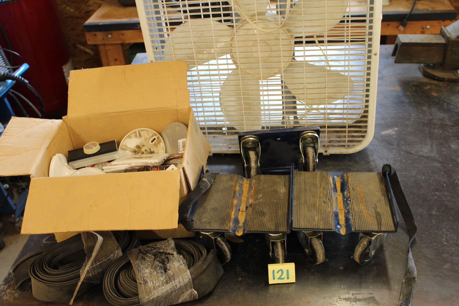 Fan, box of electrical items, 2 moving dollies, rubber edging.
