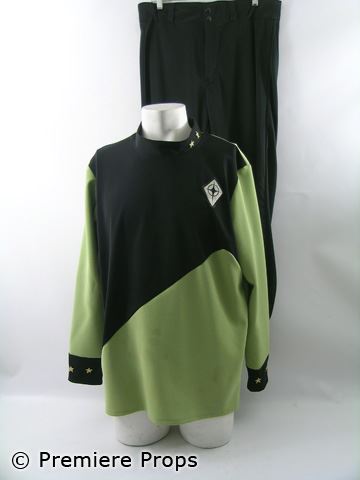 Screen used, lime green poly w/ black top diagonally cut w/ lime green bottom / 2 silver and gold stars at L side of neck and both cuffs / silver diamond patch on L breast l/s mock turtleneck top, black polyester "Champro" baseball pants (size L)