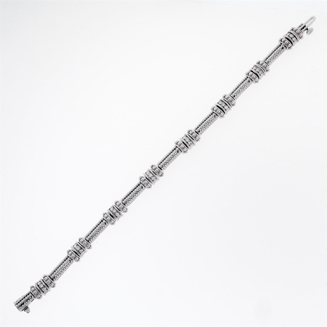 An estate solid 14k white gold twisted wire link bracelet, with 24 round brilliant cur natural diamonds (F/G - VVS2/VS1; 0.72ctw). It weighs a total of 21.86 grams, measures 7.55mm wide, and measures 7 inches in length.
