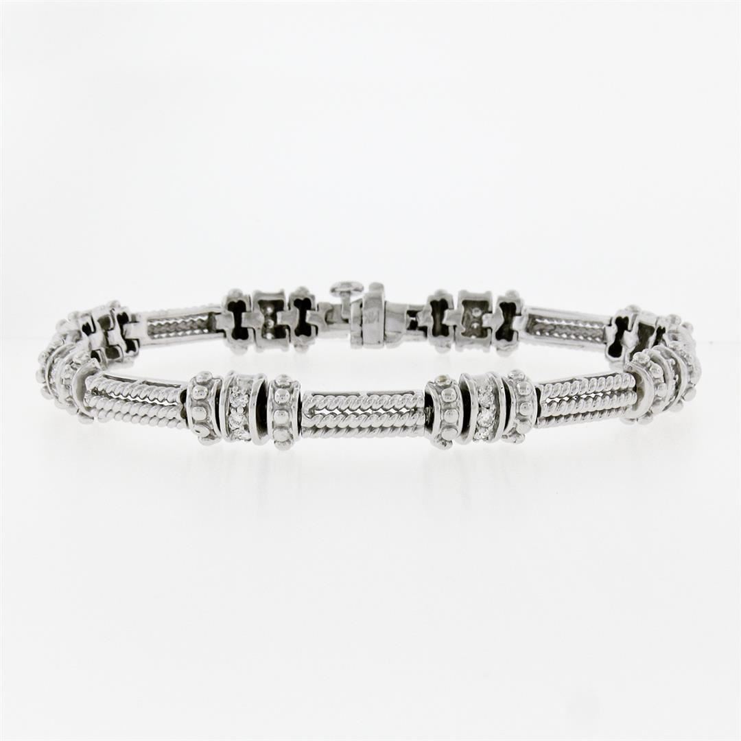 An estate solid 14k white gold twisted wire link bracelet, with 24 round brilliant cur natural diamonds (F/G - VVS2/VS1; 0.72ctw). It weighs a total of 21.86 grams, measures 7.55mm wide, and measures 7 inches in length.