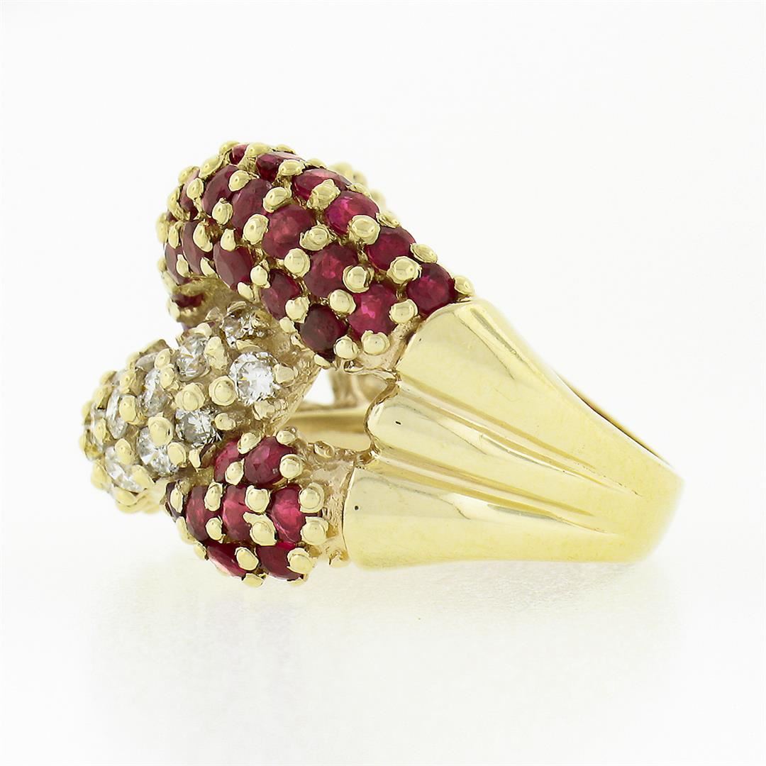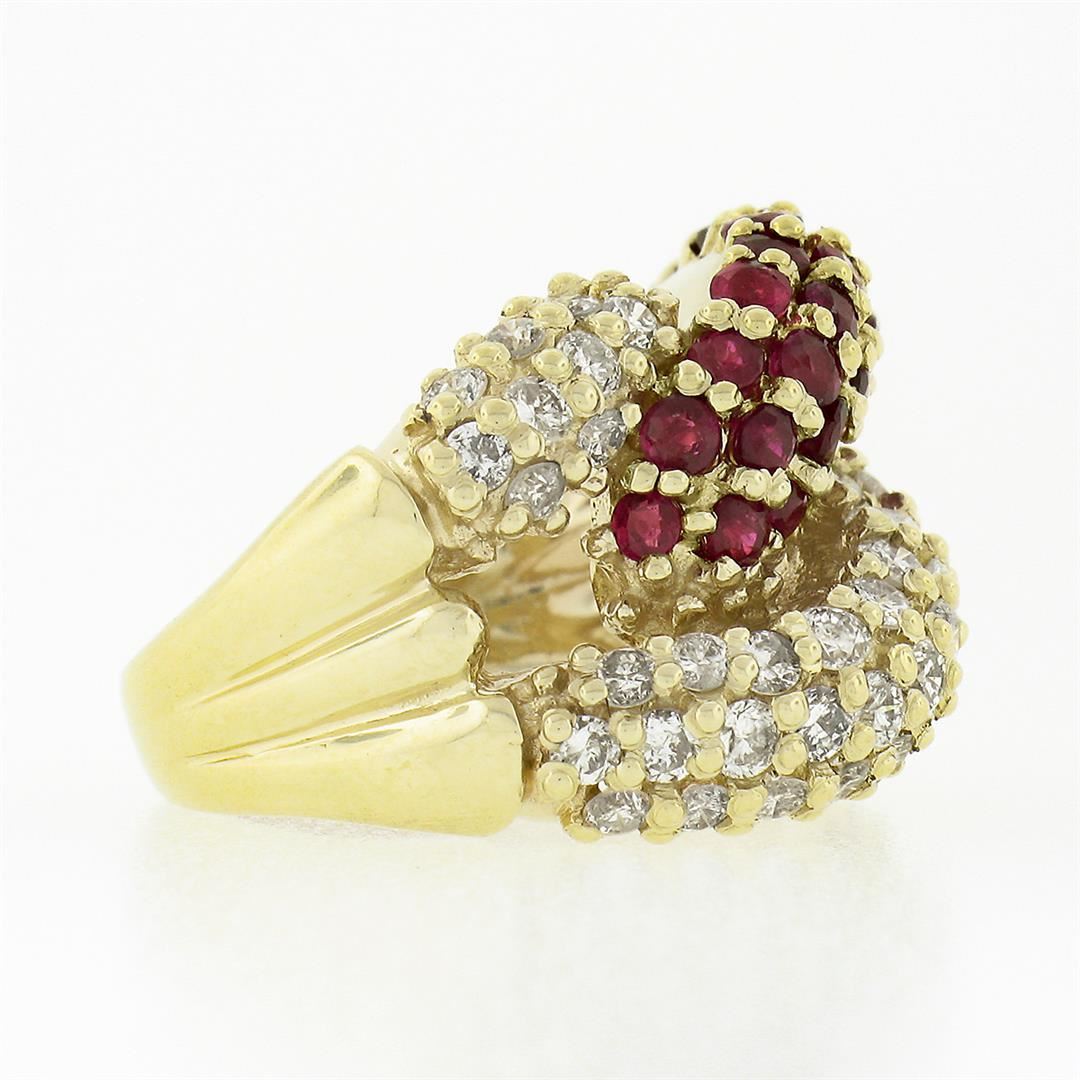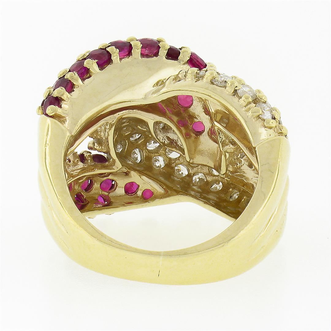 A solid 14k yellow gold wide loop ring, with 39 round brilliant cut natural diamonds (G/H - SI1/SI2 ; 1.17ctw), and 37 round brilliant cut natural rubies (1.48ctw). The ring is size 4.5, weighs a total of 10.0 grams, and measures 16.40mm wide.