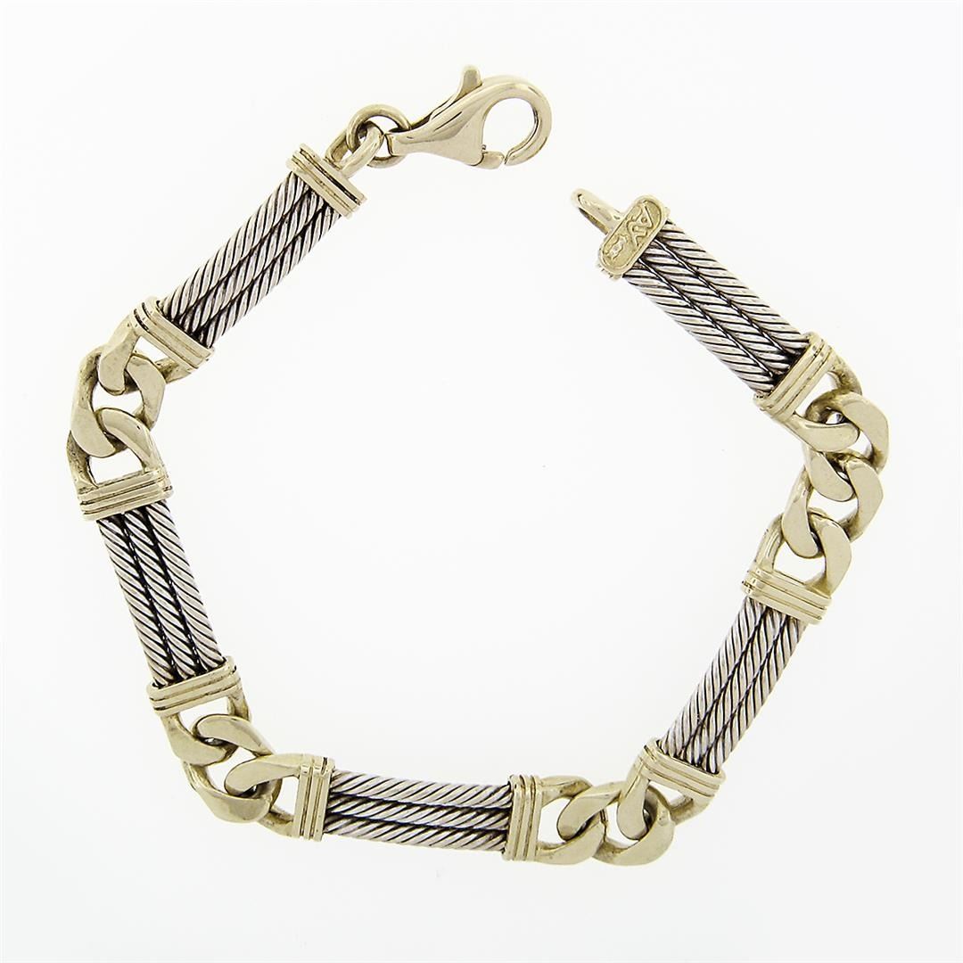 A fancy solid 14k yellow & white gold twisted wire with cuban curb link bracelet. It weighs a total of 20.59 grams, measures 7.51mm wide, and measures 6.75 inches in length.