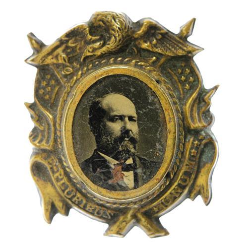 <B>Fancy 1880 James A. Garfield Ferrotype.</B></I> All Garfield portrait pins are scarce, and this is one of the most attractive varieties. Excellent but for one flake on Garfield's lapel. No pin on reverse, as made. Height 29mm.