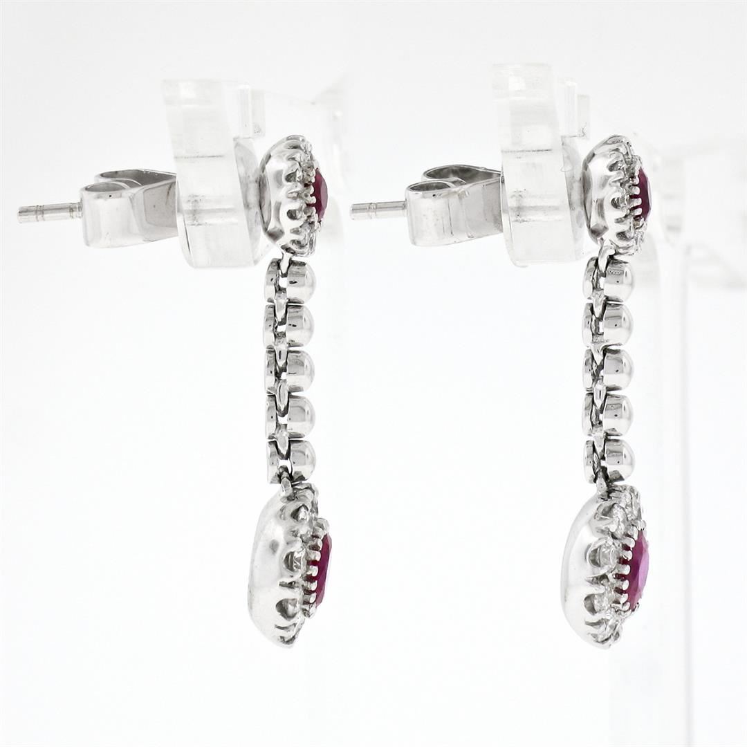 A new solid 18k white gold fancy drop dangle earrings, featuring 4 round brilliant cut natural rubies (82ctw ), and 40 round brilliant cut natural diamonds (F/G- VS2; 0.56ctw). The earrings measure approximately 24.80x8.0mm and weigh a total of 4.95 grams.