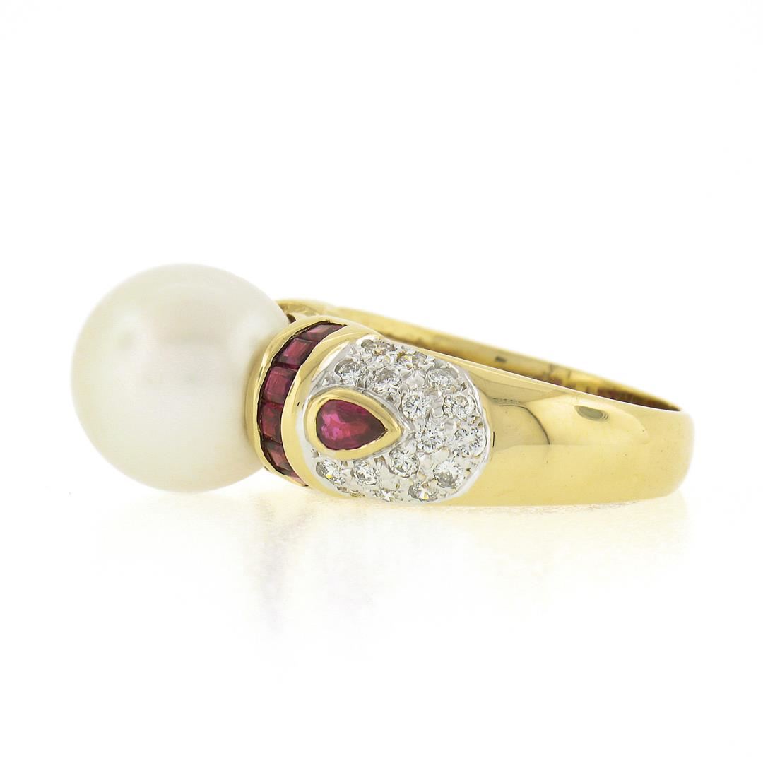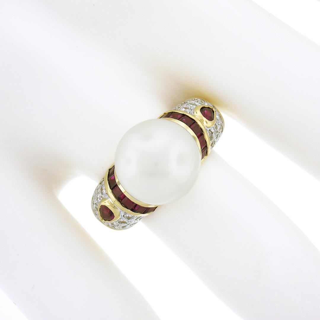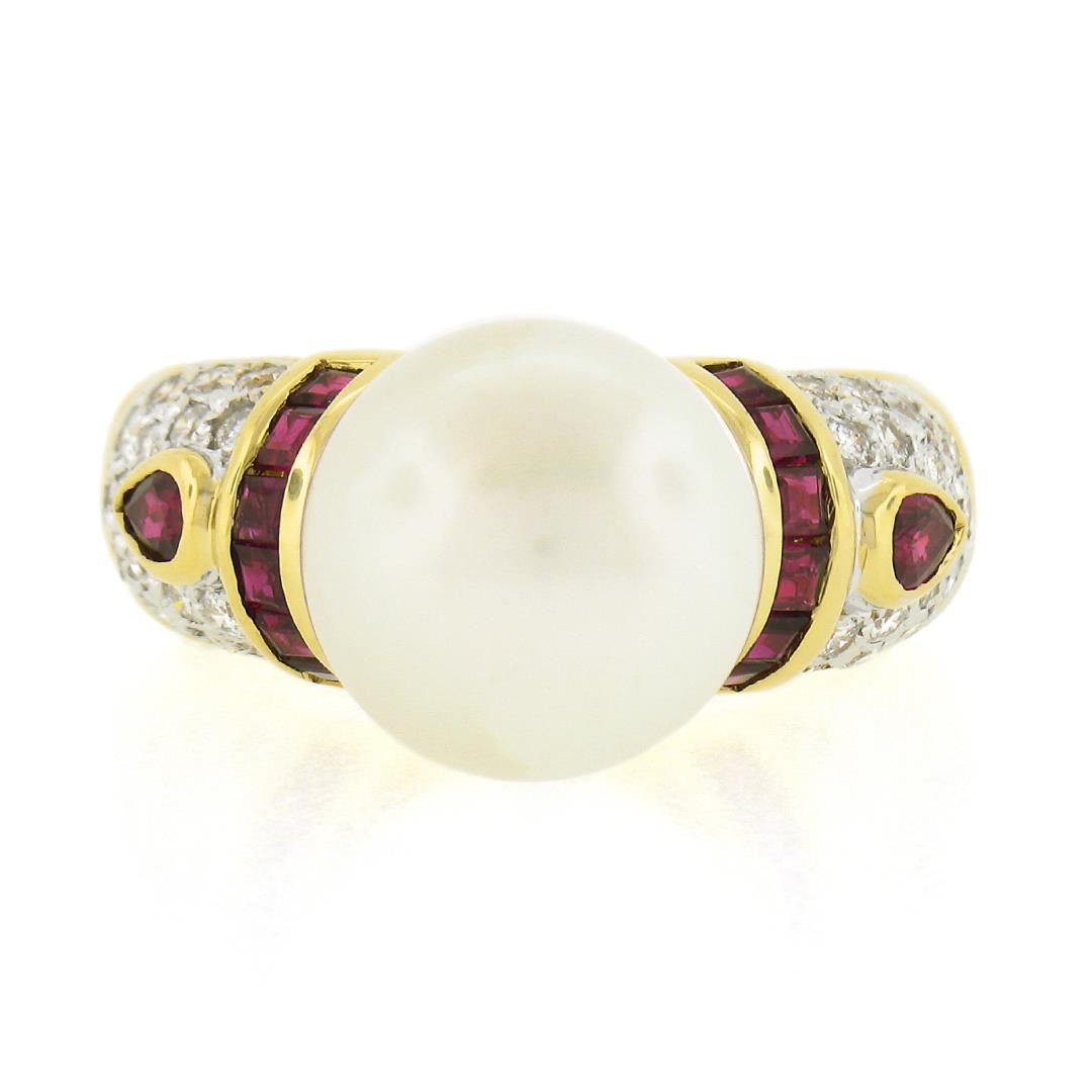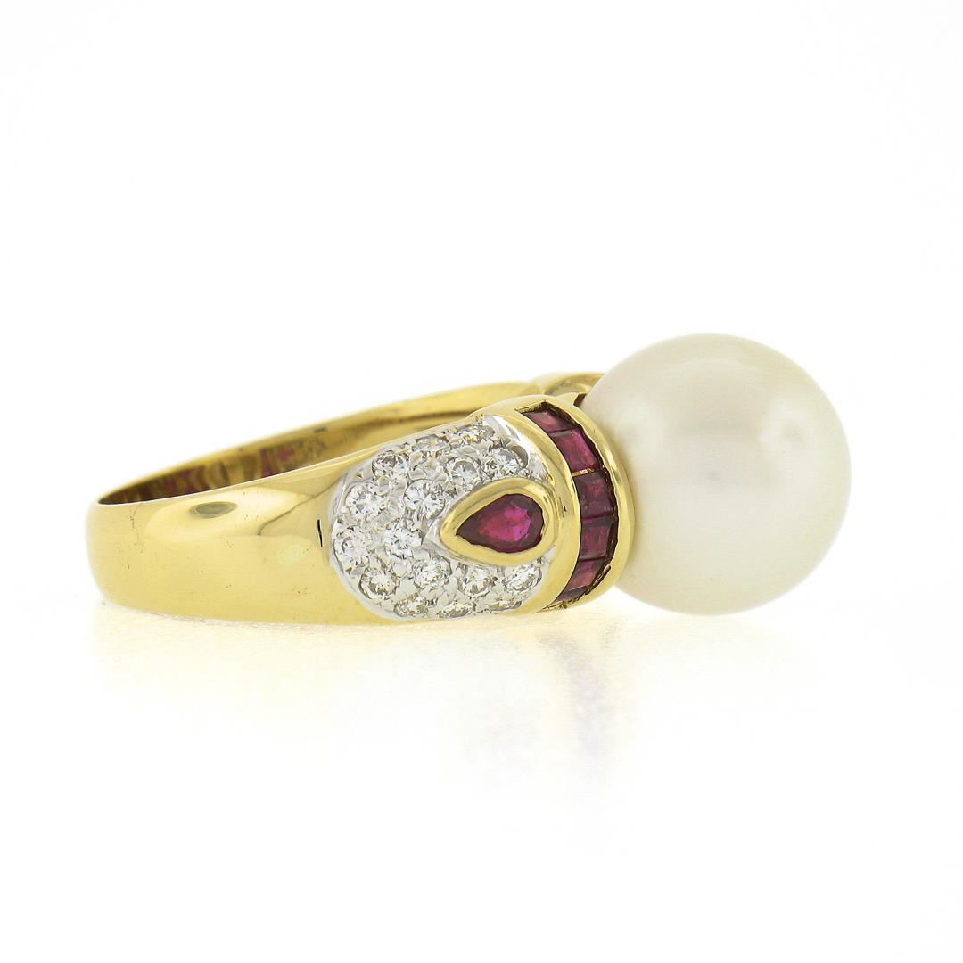 A solid 18k yellow gold ring, with 1 round shape cultured pearl (11mm), and 32 round brilliant cut natural diamonds (G/H - VS1/VS2 w/ a few SI1 ; 0.32ctw), 12 square step cut natrual rubies ( 0.60ctw ), and 2 pear cut natrual rubies (0.24ctw). The ring is size 7.0, weighs a total of 8.90 grams, and measures 8.3mm wide.