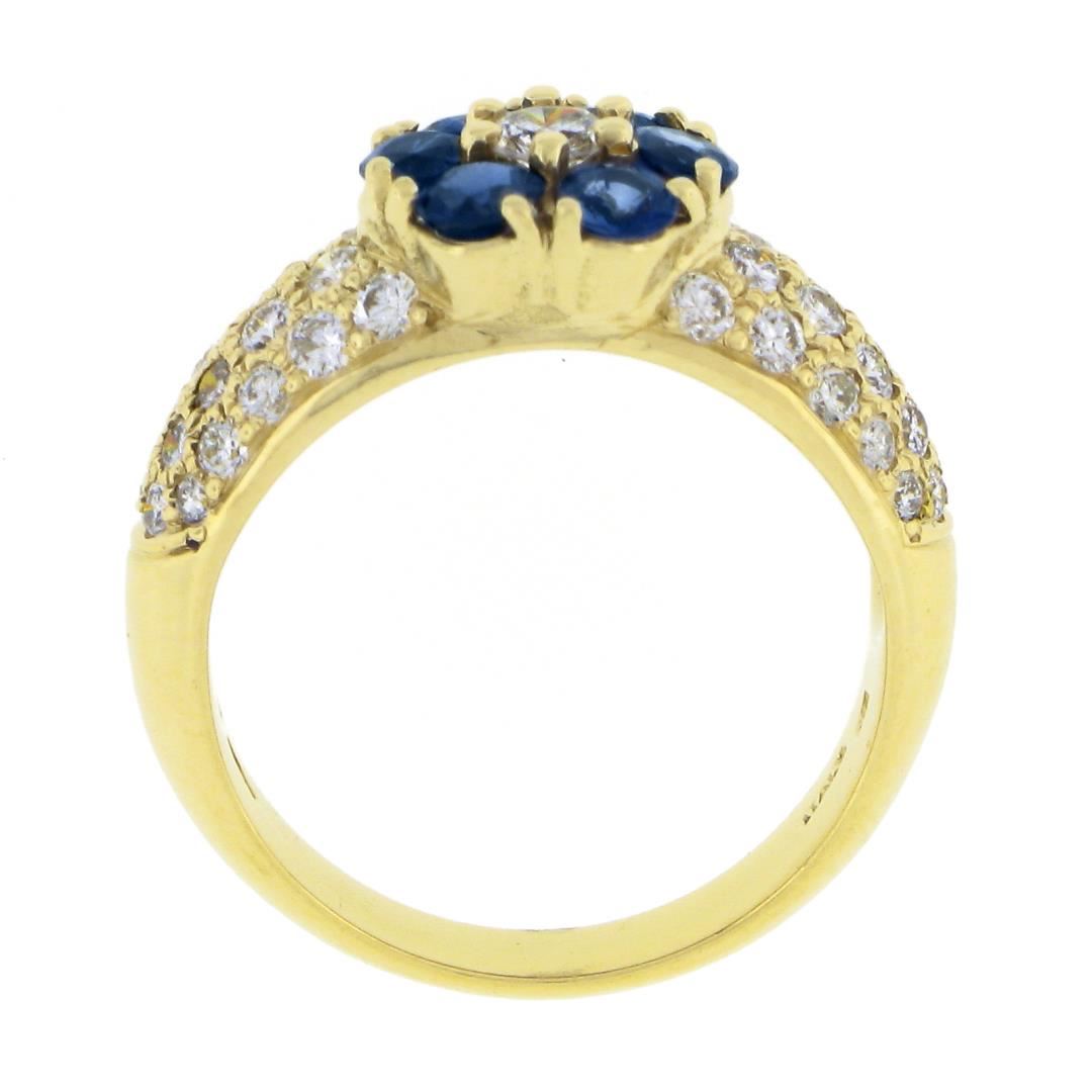 A solid 18k yellow gold flower ring, with 1 round cut natural diamond (H - SI1 ; 0.16ct ), 40 round cut natural diamonds (G/H - VS2-SI2 ; 0.55ctw ), and 6 round cut natural sapphires (1.00ctw). The ring is size 6.5, weighs a total of 5.30 grams, and measures 9.4mm wide.