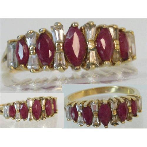 What brings our a smile on a woman? Rubies! Set in a beautiful crown setting with clear baguettes all around them! The stones are 1/3" at their widest and they stand off your finger about 1/4". These are faceted marquise that sparkle and shine against this setting! The ring is a size 6 1/2. The rubies are real too. The gold content is unknown as it is not marked. In great condition this is quite a pretty ring!!