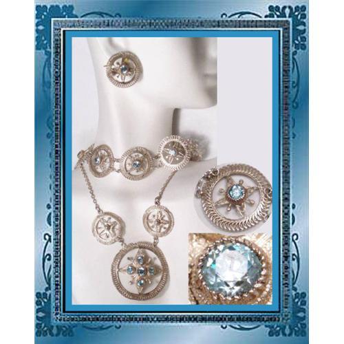 This set was purchased in Manila in the 30?s and is completely hand wrought in 800 silver and some beautifully faceted aquamarines ( see close-up). The set is complete with a necklace, bracelet and screw on earrings. You can see it is quite detailed and really fancy with all the scroll work. The necklace is 18? long with the drop being an additional 1 1/2?. There are 2 smaller medallions that are above that large one ( not included in the 1 1/2? measurement) The bracelet is 7? long and 1? wide and the earrings are 1? wide. It has a few places that have just started to turn dark ( silver does that). Other than that is is in fine condition with some of the prettiest aqua stones!!