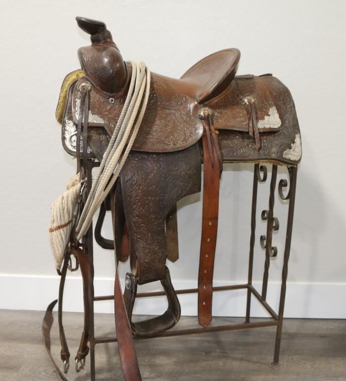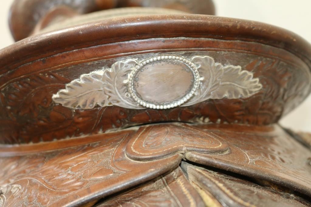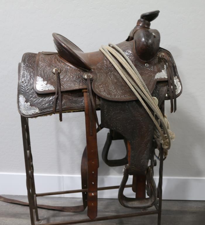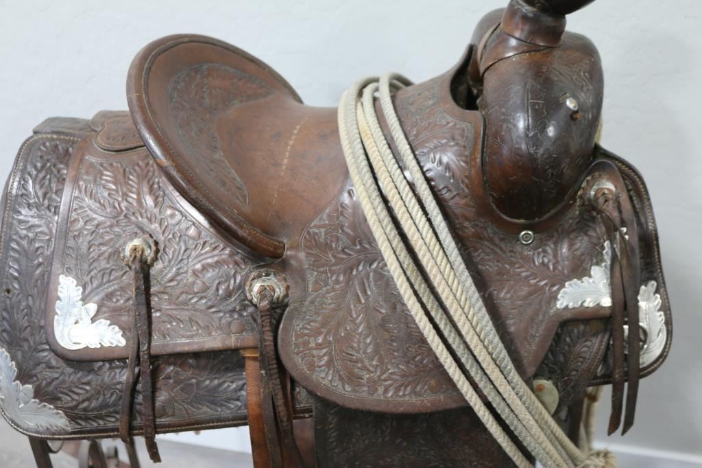 Square skirted brown leather tooled saddle with sterling silver acorn and leaf motif accents. 15" seat, unmarked, in fair to good condition. Shows age and use. Includes rope, straps